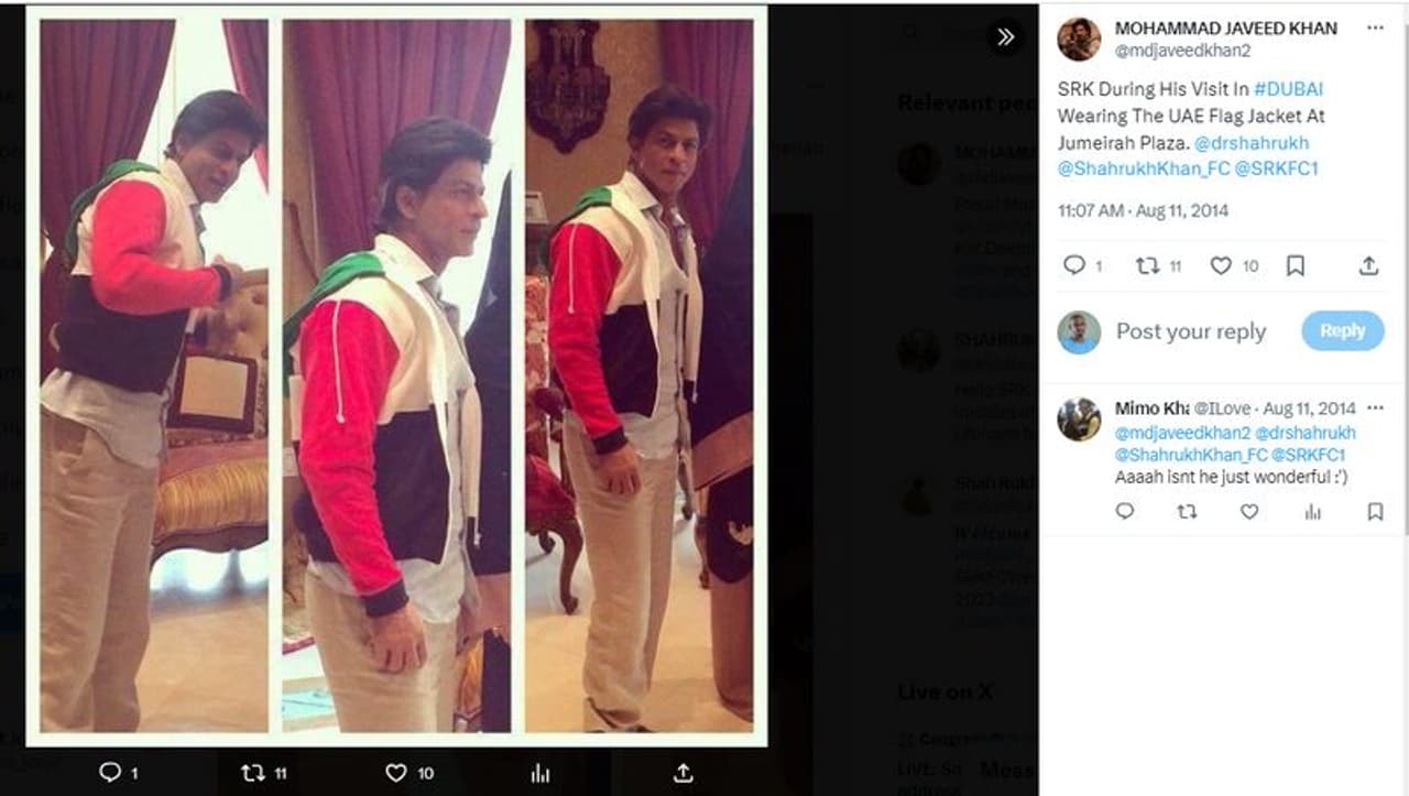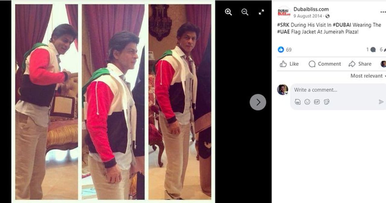 2014 ഓഗസ്റ്റ് 9ന് Dubaibliss.com എന്ന എഫ്ബി പേജില് വന്നിട്ടുള്ള പോസ്റ്റില് ഇപ്പോള് പ്രചരിക്കുന്ന സമാന ചിത്രം കണ്ടെത്തി. എസ്ആര്കെ ദുബായ് സന്ദര്ശനത്തില് യുഎഇ ഫ്ലാഗുള്ള ജാക്കറ്റ് അണിഞ്ഞ് പോസ് ചെയ്യുന്നു എന്നാണ് ഫോട്ടോയ്ക്ക് നല്കിയിരിക്കുന്ന തലക്കെട്ടില് പറയുന്നത്.