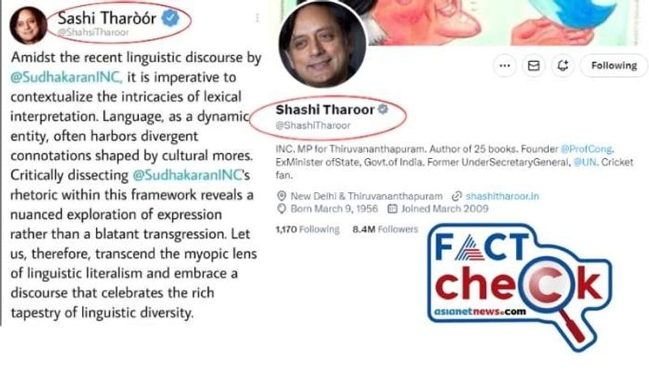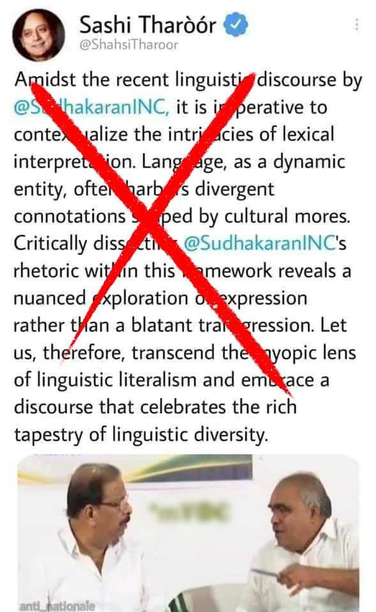 ശശി തരൂര് എംപി കടിച്ചാല് പൊട്ടാത്ത ഇംഗ്ലീഷില് കെ സുധാകരനെ ട്വീറ്റിലൂടെ വിമര്ശിച്ചു എന്നാണ് സാമൂഹ്യമാധ്യമമായ ഫേസ്ബുക്കിലെ പ്രചാരണം