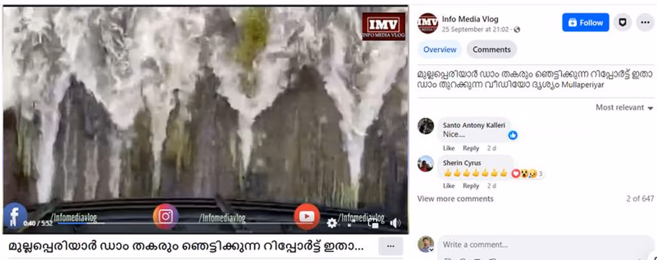 'മുല്ലപ്പെരിയാർ ഡാം തകരും, ഞെട്ടിക്കുന്ന റിപ്പോർട്ട് ഇതാ, ഡാം തുറക്കുന്ന വീഡിയോ ദൃശ്യം Mullaperiyar' എന്ന തലക്കെട്ടിലാണ് ഇന്ഫോ മീഡിയ വ്ലോഗ് എന്ന പേജ് മുല്ലപ്പെരിയാര് ഡാം തുറക്കുന്ന വീഡിയോ വിവരണം സഹിതം ഫേസ്ബുക്കില് പോസ്റ്റ് ചെയ്തിരിക്കുന്നത്. 2023 സെപ്റ്റംബര് 25-ാം തിയതിയായിരുന്നു ഈ പോസ്റ്റ്. മുല്ലപ്പെരിയാര് അടക്കം ലോകത്തെ വിവിധയിടങ്ങളിലുള്ള നിരവധി ഡാമുകള് വലിയ അപകടഭീഷണി സൃഷ്ടിക്കുന്നു എന്ന് വീഡിയോയിലുള്ള വിവരണത്തില് ന്യൂയോര്ക്ക് ടൈംസില് വന്ന ഒരു ലേഖനത്തെ പരാമര്ശിച്ച് പറയുന്നു. എഫ്ബിയില് വീഡിയോ പ്രത്യക്ഷപ്പെട്ട് നാല് ദിവസം കൊണ്ട് രണ്ടര മില്യണോളം പേര് ഈ റിപ്പോര്ട്ട് കണ്ടുകഴിഞ്ഞു. അരലക്ഷത്തോളം റിയാക്ഷന് കിട്ടിയ വീഡിയോക്ക് രണ്ടായിരത്തിയഞ്ഞൂറിലേറെ കമന്റുകളുമുണ്ട്. മുല്ലപ്പെരിയാറില് പുതിയ ഡാം വേണമെന്ന ആവശ്യം പലരും കമന്റ് ബോക്സില് മുന്നോട്ടുവെച്ചിരിക്കുന്നത് കാണാം.