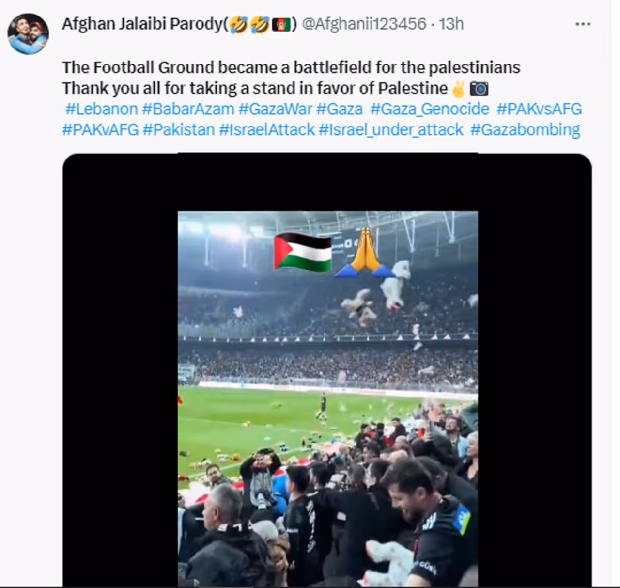 ഗ്യാലറിയില് നിന്ന് മൈതാനത്ത് സ്നേഹപൂര്വം എറിയുന്ന ഈ പാവകളെല്ലാം പലസ്തീനിലെ കുട്ടികള്ക്കുള്ളതാണ് എന്നാണ് വീഡിയോ ഷെയര് ചെയ്യുന്നവര് പറയുന്നത്