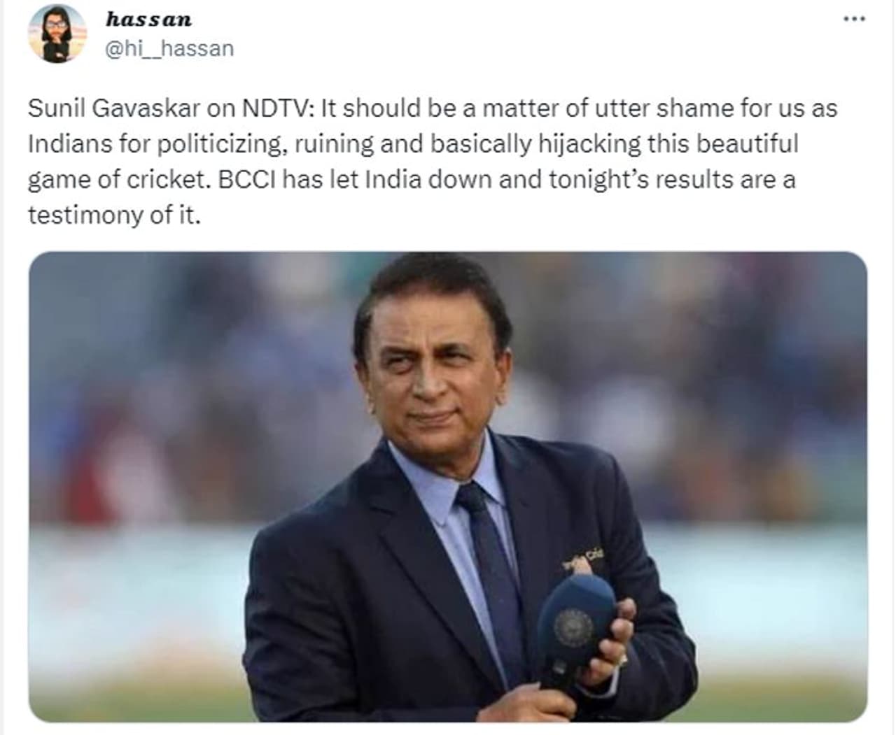ദില്ലി: ഏഷ്യാ കപ്പ് ക്രിക്കറ്റില് അടുത്ത ഇന്ത്യ- പാകിസ്ഥാന് മത്സരം വരാനിരിക്കേ സാമൂഹ്യമാധ്യമങ്ങളില് സജീവമായി ഒരു വ്യാജ പ്രചാരണം. ബിസിസിഐയെ രാഷ്ട്രീയവല്ക്കരിക്കുകയാണ് ഭരണസമിതിയിലുള്ളവരെന്നും ഇത് ക്രിക്കറ്റ് പോലൊരു മനോഹര ഗെയിമിന് നാണക്കേടാണ് എന്നും ഇതിഹാസ താരം സുനില് ഗവാസ്കര് എന്ഡിടിവിയിലൂടെ വിമര്ശിച്ചു എന്നാണ് പ്രചാരണം. ഈ പ്രചാരണത്തിന്റെ വസ്തുത ഇപ്പോള് പുറത്തുവന്നിരിക്കുകയാണ്.