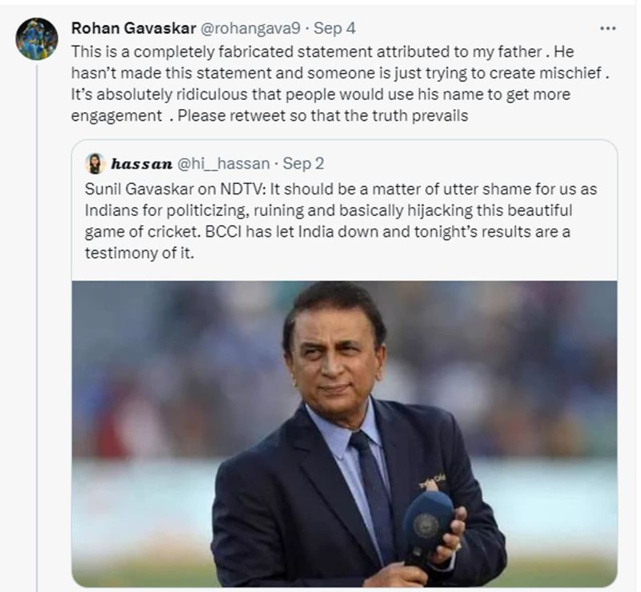 സുനില് ഗവാസ്കര് എന്ഡിടിവിയോട് ഇത്തരമൊരു പ്രസ്താവനയും നടത്തിയിട്ടില്ല എന്ന് അദേഹത്തിന്റെ മകനും ക്രിക്കറ്ററുമായ രോഹന് ഗവാസ്കര് സെപ്റ്റംബര് നാലിന് ട്വിറ്ററിലൂടെ വ്യക്തമാക്കിയിരുന്നു. വളച്ചൊടിച്ച വാക്കുകളാണ് തന്റെ പിതാവിന്റെ പേരില് പ്രചരിക്കുന്നത്, ശ്രദ്ധയാകര്ഷിക്കാന് വേണ്ടി അദേഹത്തിന്റെ പേര് ആളുകള് ദുരുപയോഗം ചെയ്യുന്നത് ഞെട്ടിക്കുന്നു എന്നും രോഹന് ട്വീറ്റ് ചെയ്തിരുന്നു. എന്ഡിടിവിയോട് എന്നല്ല, മറ്റൊരു മാധ്യമത്തോടും ഗവാസ്കര് ബിസിസിഐക്ക് എതിരായി പ്രസ്താവന നടത്തിയതായി ആധികാരികമായ വാര്ത്തകളൊന്നും കണ്ടെത്താനായിട്ടില്ല. സെപ്റ്റംബര് രണ്ടിലെ ഇന്ത്യ- പാക് മത്സരത്തിന് ശേഷം ടീം ഇന്ത്യയുടെ പ്രകടനത്തെ മുന്നിര്ത്തി ബിസിസിഐയെ കുറിച്ച് ഗവാസ്കര് പ്രസ്താവനകളൊന്നും നടത്തിയിട്ടില്ല എന്ന് വ്യക്തമാണ്.