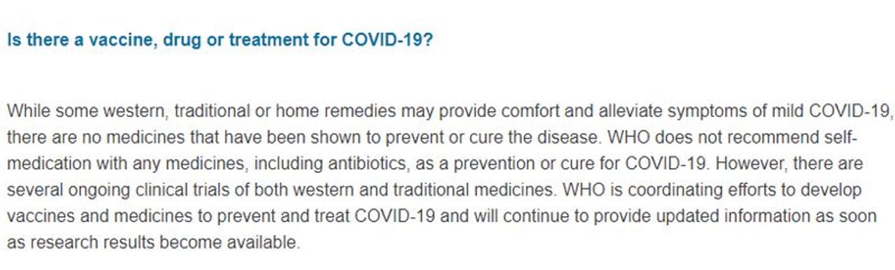 കൊവിഡ് 19ന് മരുന്നോ വാക്സിനോ കണ്ടെത്താന് കഴിഞ്ഞതായി ലോകാരോഗ്യ സംഘടന സ്ഥിരീകരിച്ചിട്ടില്ല. വാക്സിനായി തീവ്ര പരിശ്രമങ്ങള് ലോകത്ത് നടക്കുകയാണ്. ഗുരുതര രോഗികളില് ചില മരുന്നുകള് ഉപയോഗിക്കാന് മാത്രമാണ് നിലവില് അനുമതിയുള്ളത്. കൊവിഡോള് കൊവിഡ് മാറ്റുമെന്ന് ശാസ്ത്രീയമായി ഇതുവരെ തെളിയിക്കപ്പെട്ടിട്ടില്ല.