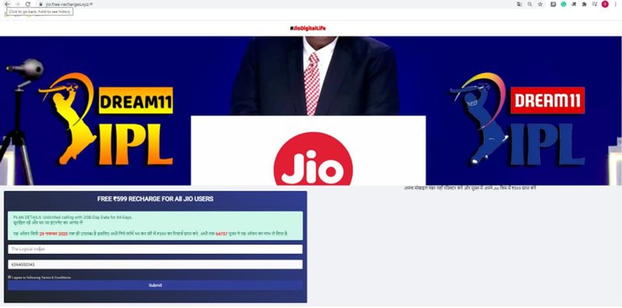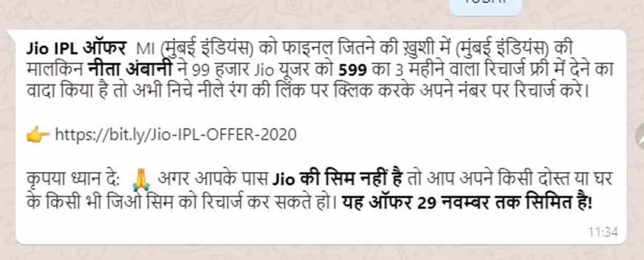 മുംബൈ ഇന്ത്യന്സിന്റെ ജയം ആഘോഷിക്കാന് ആരാധകര്ക്ക് സൗജന്യ റീച്ചാര്ജ് നല്കുന്നു എന്നാണ് സന്ദേശത്തില് പറയുന്നത്. 599 രൂപയുടെ ജിയോ റീച്ചാര്ജ് 99,000 പേര്ക്ക് സൗജ്യനമായി നിതാ അംബാനി പ്രഖ്യാപിച്ചതായും ഇത് ലഭിക്കാന് ലിങ്കില് ക്ലിക്ക് ചെയ്യാനും ആവശ്യപ്പെട്ടാണ് സന്ദേശം പ്രചരിക്കുന്നത്. നവംബര് 29 വരെയാണ് ഈ ഓഫര് ലഭ്യമാവുക എന്നും സന്ദേശത്തിലുണ്ട്.