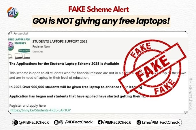 ഒരു ഫോം പൂരിപ്പിച്ച് നല്കിയാല് വിദ്യാര്ഥികള്ക്ക് കേന്ദ്ര സര്ക്കാരിന്റെ വക സൗജന്യ ലാപ്ടോപ്പ് ലഭിക്കുമെന്നായിരുന്നു സോഷ്യല് മീഡിയയില് വ്യാപകമായ മറ്റൊരു പ്രചാരണം. 'സ്റ്റുഡന്റ്സ് ലാപ്ടോപ്പ് സ്കീം 2025' എന്ന പേരിലാണ് ഒരു ലിങ്ക് സഹിതം വാട്സ്ആപ്പ് മെസേജ് പ്രചരിക്കുന്നത്. സംഭവം യഥാര്ഥമാണെന്ന് കരുതി നിരവധി പേര് ഈ മെസേജ് പങ്കുവെക്കുകയും ചെയ്തു. എന്നാല് 'സ്റ്റുഡന്റ്സ് ലാപ്ടോപ്പ് സ്കീം 2025' എന്ന പേരില് കേന്ദ്ര സര്ക്കാരിനൊരു പദ്ധതിയില്ലെന്ന് പ്രസ് ഇന്ഫര്മേഷന് ബ്യൂറോയുടെ ഫാക്ട് ചെക്ക് വിഭാഗം അറിയിച്ചു. ആരും വ്യാജ ലിങ്കുകളില് ക്ലിക്ക് ചെയ്ത് വഞ്ചിതരാവരുത് എന്നും പിഐബി അഭ്യര്ഥിച്ചു. വിദ്യാര്ഥികള്ക്കായുള്ള സൗജന്യ ലാപ്ടോപ് പദ്ധതിയെ കുറിച്ചുള്ള വ്യാജ പ്രചാരണം സോഷ്യല് മീഡിയയില് ഇതാദ്യമല്ല. കൊവിഡ് ലോക്ഡൗണ് കാലത്ത് മുതല് ഇത്തരം പ്രചാരണം സജീവമായിരുന്നു. ഈ വര്ഷം തന്നെ സമാനമായ സന്ദേശങ്ങള് ഏറെ വാട്സ്ആപ്പില് പ്രചരിച്ചിരുന്നു.