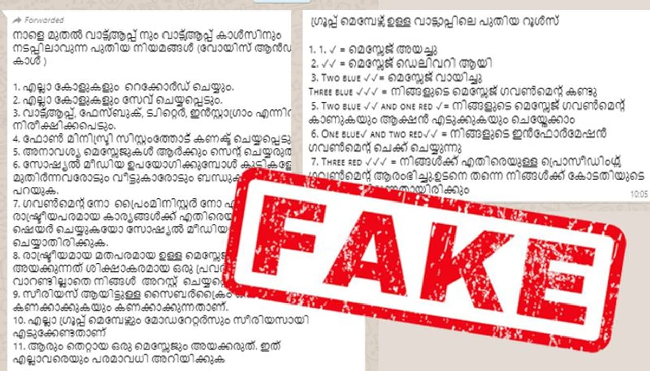 'നാളെ മുതൽ വാട്സ്ആപ്പിനും വാട്സ്ആപ്പ് കോൾസിനും നടപ്പിലാവുന്ന പുതിയ നിയമങ്ങൾ, Tʜʀᴇᴇ ʙʟᴜᴇ ✓✓✓ = നിങ്ങളുടെ മെസ്സേജ് ഗവൺമെന്റ് കണ്ടു, എല്ലാ കോളുകളും റെക്കോർഡ് ചെയ്യും.... എന്ന രീതിയിൽ വാട്സാപ്പിൽ പ്രചരിക്കുന്ന വാർത്ത ശരിയാണോ എന്ന് ചോദിച്ചുകൊണ്ട് നിരവധി പേർ ഈ പേജിലേക്ക് മെസ്സേജ് അയക്കുന്നുണ്ട്. ഈ വാർത്ത വ്യാജമാണെന്ന് കേന്ദ്ര ഗവൺമെന്റിന്റെ ഫാക്ട് ചെക്ക് വിഭാഗമായ PIB Fact Check നേരത്തെ തന്നെ വിശദീകരിച്ചുകൊണ്ട് ട്വീറ്റ് ചെയ്തിട്ടുണ്ട്. ലിങ്ക് കാണുക.