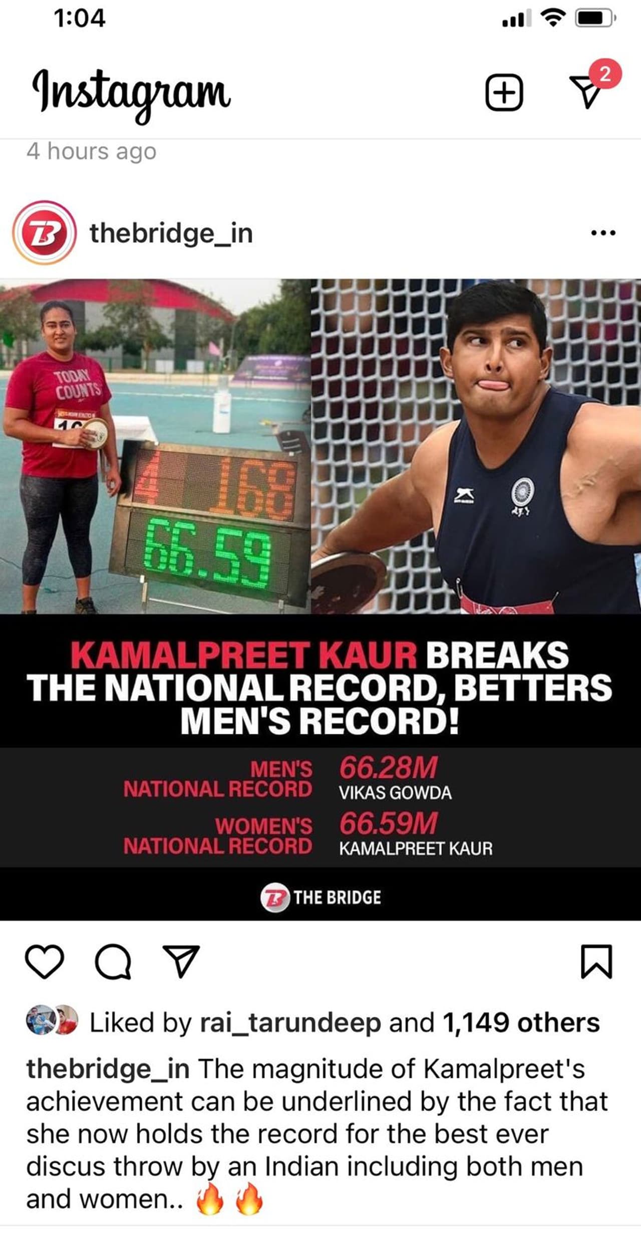 'കമാല്പ്രീത് കൗര് ദേശീയ റെക്കോര്ഡ് തകര്ത്തു, പുരുഷന്മാരുടെ റെക്കോര്ഡിനേക്കാള് മികച്ചത്'- എന്നായിരുന്നു ഇന്സ്റ്റഗ്രാം പോസ്റ്റ്.