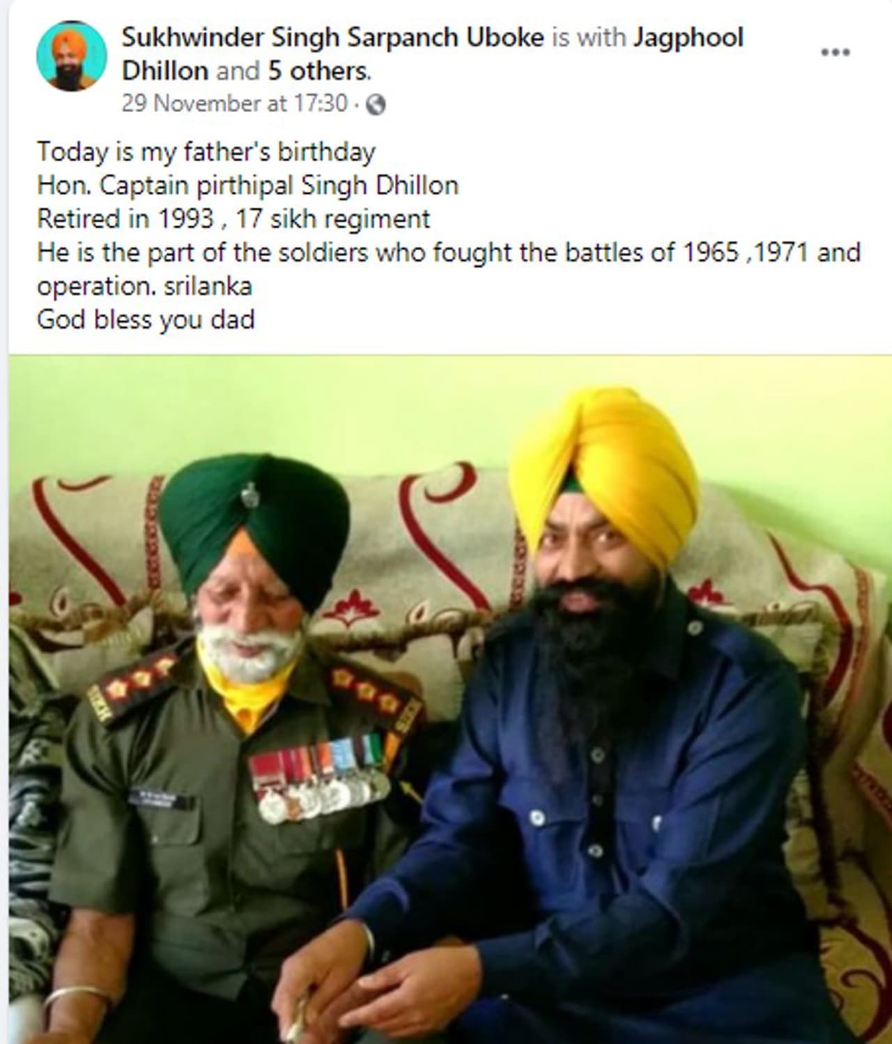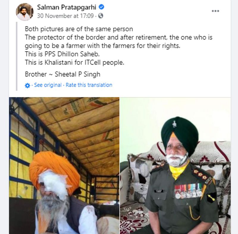ചിത്രത്തില് മിലിട്ടറി യൂണിഫോമിലുള്ളത് ഇന്ത്യന് ആര്മിയില് നിന്ന് വിരമിച്ച ക്യാപ്റ്റന് പിര്ത്തിപാല് സിംഗാണ്. എന്നാല് അദേഹം കര്ഷക സമരത്തില് പങ്കെടുക്കുന്നില്ല. ഇക്കാര്യം പിര്ത്തിപാല് സിംഗിന്റെ മകന് സുഖ്വീന്ദര് സിംഗ് ഇന്ത്യ ടുഡേയോട് സ്ഥിരീകരിച്ചു. പിര്ത്തിപാല് സിംഗിന്റെ 74-ാം പിറന്നാള് ദിനമെടുത്ത ചിത്രമാണ് ഇപ്പോള് പ്രചരിക്കുന്നത്.