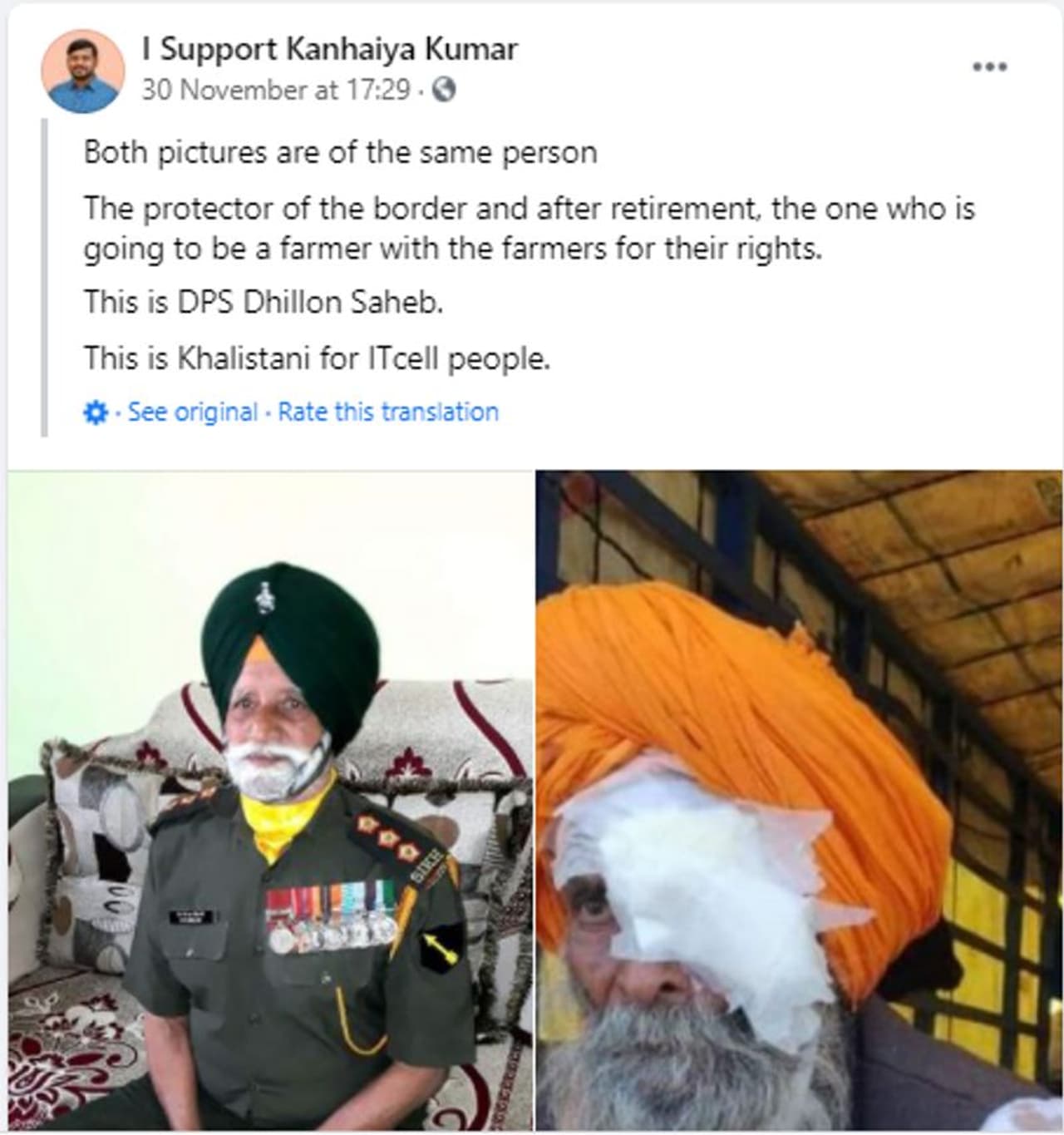 'രണ്ട് ചിത്രങ്ങളിലും ഉള്ളത് ഒരേ ആളാണ്. ഒരാള് അതിര്ത്തിയുടെ സംരക്ഷകനും മറ്റൊരാള് വിരമിക്കലിന് ശേഷം കര്ഷകരുടെ അവകാശങ്ങള്ക്കായി പോരാടുന്നയാളും' എന്നാണ് ഫേസ്ബുക്കില് പ്രത്യക്ഷപ്പെട്ട പോസ്റ്റുകളിലൊന്ന്.