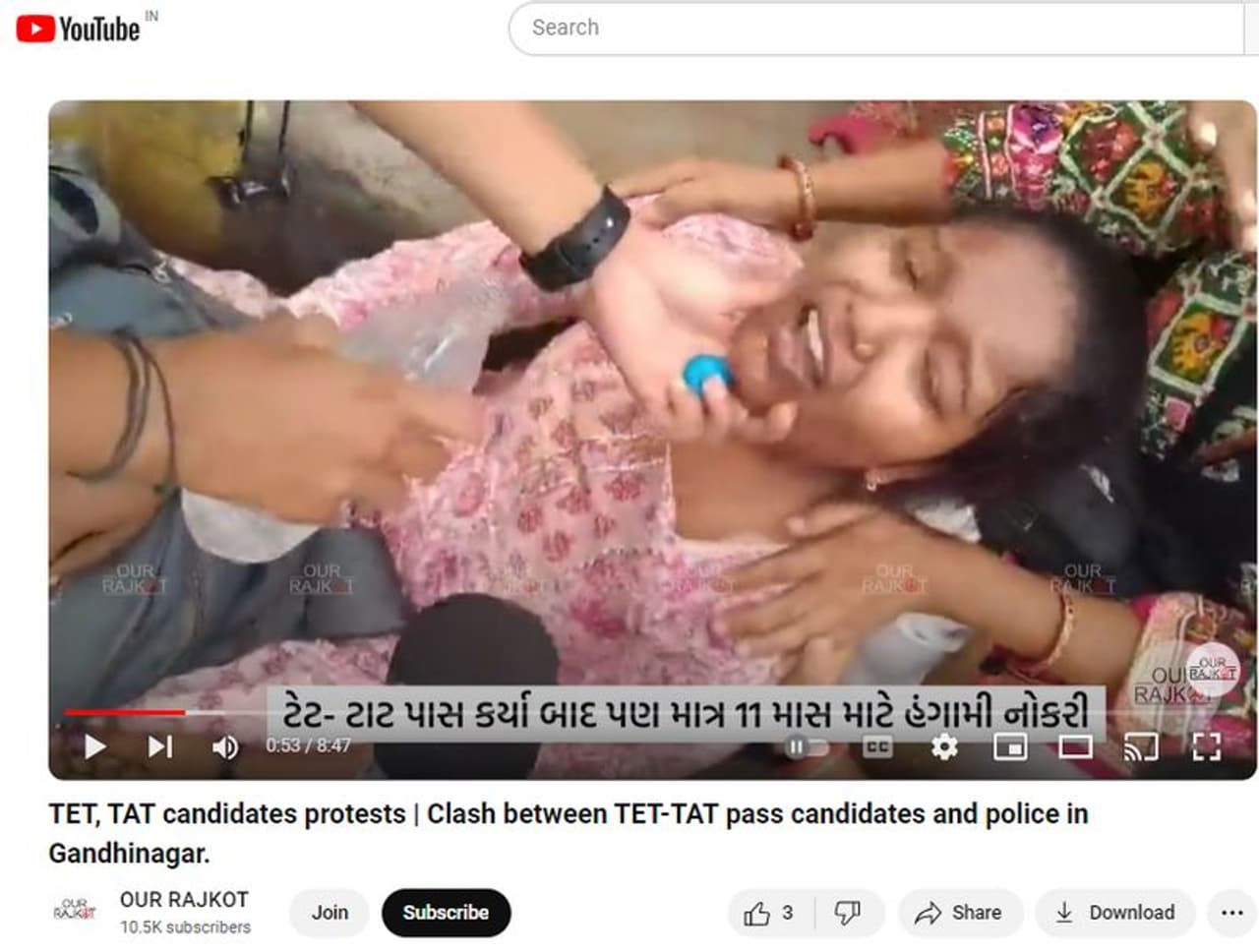 നീറ്റ് പരീക്ഷ ക്രമക്കേടിന് പിന്നാലെ പ്രതിഷേധിക്കുന്ന വിദ്യാര്ഥിനിയുടെ ദൃശ്യമല്ല ഇത്. ഗുജറാത്ത് സര്ക്കാരിന്റെ അധ്യാപക നിയമനവുമായി ബന്ധപ്പെട്ട് ഉദ്യോഗാര്ഥികള് നടത്തുന്ന പ്രതിഷേധത്തില് നിന്നുള്ള വീഡിയോയാണ് നീറ്റ് പരീക്ഷ വിവാദവുമായി ബന്ധപ്പെടുത്തി ഇപ്പോള് പ്രചരിപ്പിക്കുന്നത്. നീറ്റ് പരീക്ഷ ക്രമക്കേടിന് എതിരായ പ്രതിഷേധം എന്ന പേരില് തെറ്റായി പ്രചരിക്കുന്ന വീഡിയോയുടെ പൂര്ണരൂപം റിവേഴ്സ് ഇമേര്ജ് സെര്ച്ചില് ലഭിച്ചു. ആ വീഡിയോ ചുവടെ ചേര്ക്കുന്നു.