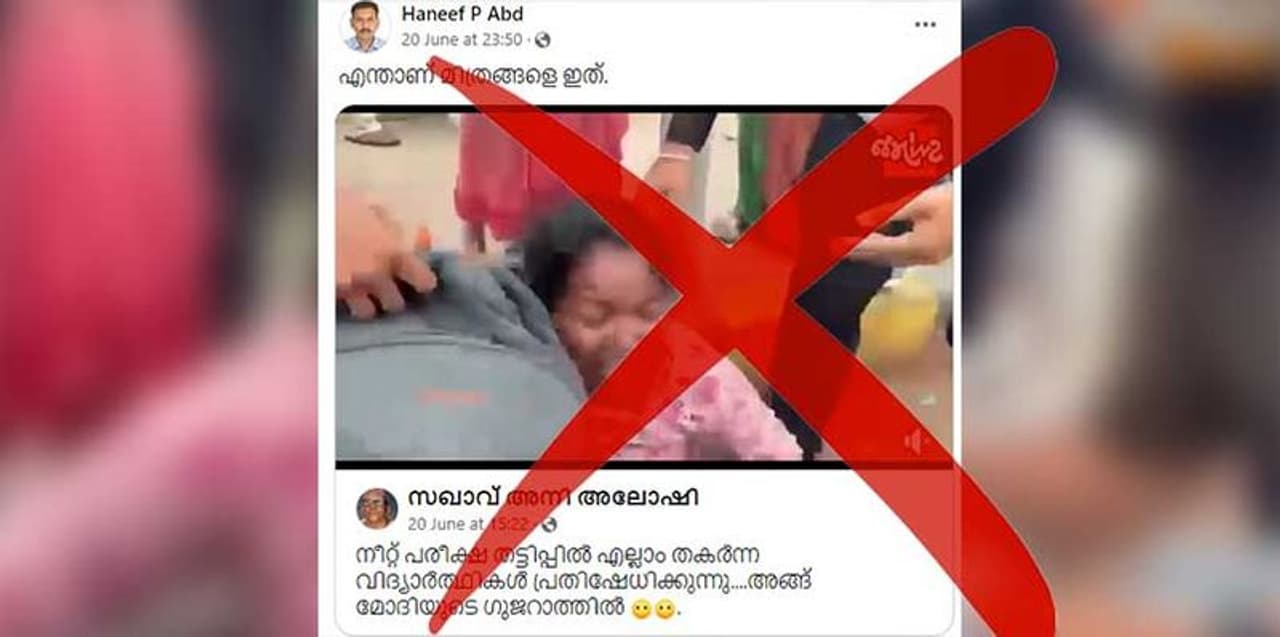 'നീറ്റ് പരീക്ഷ തട്ടിപ്പിൽ എല്ലാം തകർന്ന വിദ്യാർത്ഥികൾ പ്രതിഷേധിക്കുന്നു...അങ്ങ് മോദിയുടെ ഗുജറാത്തിൽ'- എന്ന മലയാളം കുറിപ്പോടെയാണ് വീഡിയോ ഫേസ്ബുക്കില് പോസ്റ്റ് ചെയ്തിരിക്കുന്നത്. ഒരു സ്ത്രീയെ രണ്ട് പേര് വലിച്ചിഴച്ച് കൊണ്ടുപോകുന്ന ദൃശ്യങ്ങളാണിത്. പൊട്ടിക്കരയുന്ന ഇവരോട് മാധ്യമപ്രവര്ത്തക വിവരങ്ങള് ചോദിച്ചറിയുന്നതും മറ്റൊരാളെത്തി കുടിക്കാന് വെള്ളം നല്കുന്നതും വേറൊരാള് ആശ്വസിപ്പിക്കാന് ശ്രമിക്കുന്നതും വീഡിയോയിലുണ്ട്. നീറ്റ് പരീക്ഷ ക്രമക്കേടിനെ തുടര്ന്ന് പ്രതിഷേധിക്കുന്ന വിദ്യാര്ഥിനിയുടെ ദൃശ്യങ്ങളാണിത് എന്നാണ് വീഡിയോ പങ്കുവെക്കുന്നവരുടെ അവകാശവാദം.