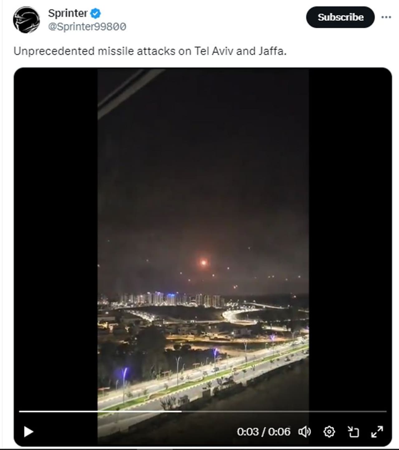 ടെൽ അവീവ്, ജാഫ എന്നിവിടങ്ങളിൽ അഭൂതപൂർവമായ മിസൈൽ ആക്രമണം ഹമാസ് നടത്തുന്നു എന്ന തലക്കെട്ടോടെയാണ് ആറ് സെക്കന്ഡ് ദൈര്ഘ്യമുള്ള വീഡിയോ ട്വീറ്റ് ചെയ്തിരിക്കുന്നത്. സ്പ്രിന്ററിന്റെ വെരിഫൈഡ് അക്കൗണ്ടില് നിന്ന് 2023 ഒക്ടോബര് 12-ാം തിയതിയാണ് ട്വീറ്റ് വന്നിരിക്കുന്നത്. വരുന്ന നിരവധി റോക്കറ്റുകളെ ഇസ്രയേലിന്റെ അയേണ് ഡോം സംവിധാനം ആകാശത്ത് വച്ച് തകര്ക്കുന്നത് വീഡിയോയില് വ്യക്തമായി കാണാം.
