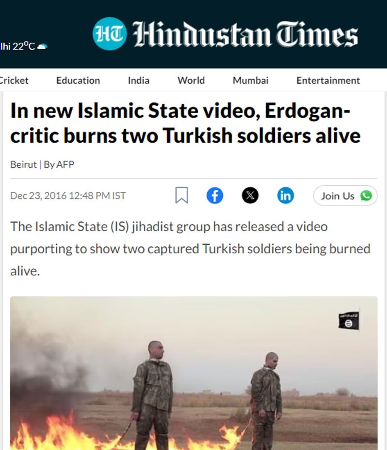 ഇസ്രയേലി സൈനികര്ക്ക് നേരെ ഹമാസ് നടത്തുന്ന ക്രൂരതയോ ഈ വീഡിയോയില് എന്ന് ഉറപ്പിക്കാന് വിശദമായ പരിശോധനകള് ഏഷ്യാനെറ്റ് ന്യൂസ് ഓണ്ലൈന് ഫാക്ട് ചെക്ക് ടീം നടത്തി. റിവേഴ്സ് ഇമേജ് സെര്ച്ച് ഫലങ്ങള് നിരീക്ഷിച്ചപ്പോള് ദേശീയ മാധ്യമായ ഹിന്ദുസ്ഥാന് ടൈംസ് രാജ്യാന്തര വാര്ത്താ ഏജന്സിയായ എഎഫ്പിയെ ഉദ്ധരിച്ച് 2016 ഡിസംബര് 23ന് നല്കിയ ഒരു വാര്ത്ത കാണാനായി. രണ്ട് തുര്ക്കി പട്ടാളക്കാരെ പിടികൂടിയ ശേഷം ജീവനോടെ ചുട്ടുകൊന്നു എന്നവകാശപ്പെട്ട് ഇസ്ലാമിക് സ്റ്റേറ്റ് (ഐഎസ്) ഭീകരര് പുറത്തുവിട്ട വീഡിയോയാണിത് എന്നാണ് ഹിന്ദുസ്ഥാന് വാര്ത്തയുടെ തലക്കെട്ട്. ഇസ്രയേല് സൈനികര്ക്കെതിരായ ഹമാസ് ക്രൂരത എന്ന അവകാശവാദത്തോടെ പ്രചരിക്കുന്ന വീഡിയോയുടെ തുടക്കത്തിലെ ദൃശ്യങ്ങളില് നിന്നെടുത്ത സ്ക്രീന്ഷോട്ടാണ് ഹിന്ദുസ്ഥാന് ടൈംസ് വാര്ത്തയ്ക്ക് നല്കിയിരിക്കുന്നത്. സിറിയയില് നിന്നുള്ള വീഡിയോയാണിത് എന്നാണ് അനുമാനമെന്ന് വാര്ത്തയിലുണ്ട്.