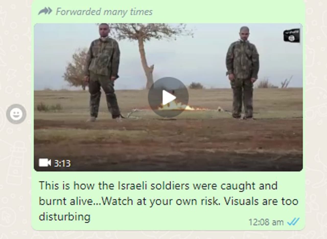 കൈകാലുകള് ചങ്ങല കൊണ്ട് ബന്ധിച്ച ശേഷം സൈനികരെ ജീവനോടെ ചുട്ടുകൊല്ലുന്ന ഞെട്ടിക്കുന്ന ദൃശ്യങ്ങളാണ് വീഡിയോയിലുള്ളത്. 'ഇങ്ങനെയാണ് ഇസ്രയേലി സൈനികരെ പിടികൂടുന്നതും ജീവനോടെ ചുട്ടുകൊല്ലുന്നതും. വളരെ അസ്വസ്ഥപ്പെടുത്തുന്ന ദൃശ്യങ്ങളാണിത്. സ്വന്തം ഉത്തരവാദിത്തത്തോടെ മാത്രം കാണുക' എന്നുമുള്ള മുന്നറിയിപ്പോടെയാണ് വീഡിയോ വാട്സ്ആപ്പില് ഷെയര് ചെയ്യപ്പെടുന്നത്. മൂന്ന് മിനുറ്റും 13 സെക്കന്ഡുമാണ് ഈ വീഡിയോയുടെ ദൈര്ഘ്യം. സൈനികര് മരണത്തോട് മല്ലടിക്കുന്ന ഈ കാഴ്ച ആരെയും കരയിപ്പിക്കും. ഇവര് കൊല്ലപ്പെട്ടു എന്നുറപ്പിക്കാന് അഗ്നിയിലേക്ക് വീണ്ടും ഡീസല് പോലെയുള്ള എന്തോ ഇന്ധനം ഒഴിക്കുന്നതും വീഡിയോയിലുണ്ട്. ദൃശ്യങ്ങളുടെ അവസാന ഭാഗത്ത് തോക്കുധാരിയായ ഒരാള് നിന്ന് സംസാരിക്കുന്നതും കാണാം. എന്നാല് ഈ ഓഡിയോ ഇംഗ്ലീഷ് ഭാഷയിലല്ല.