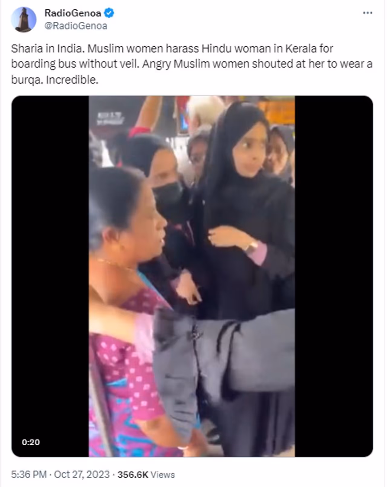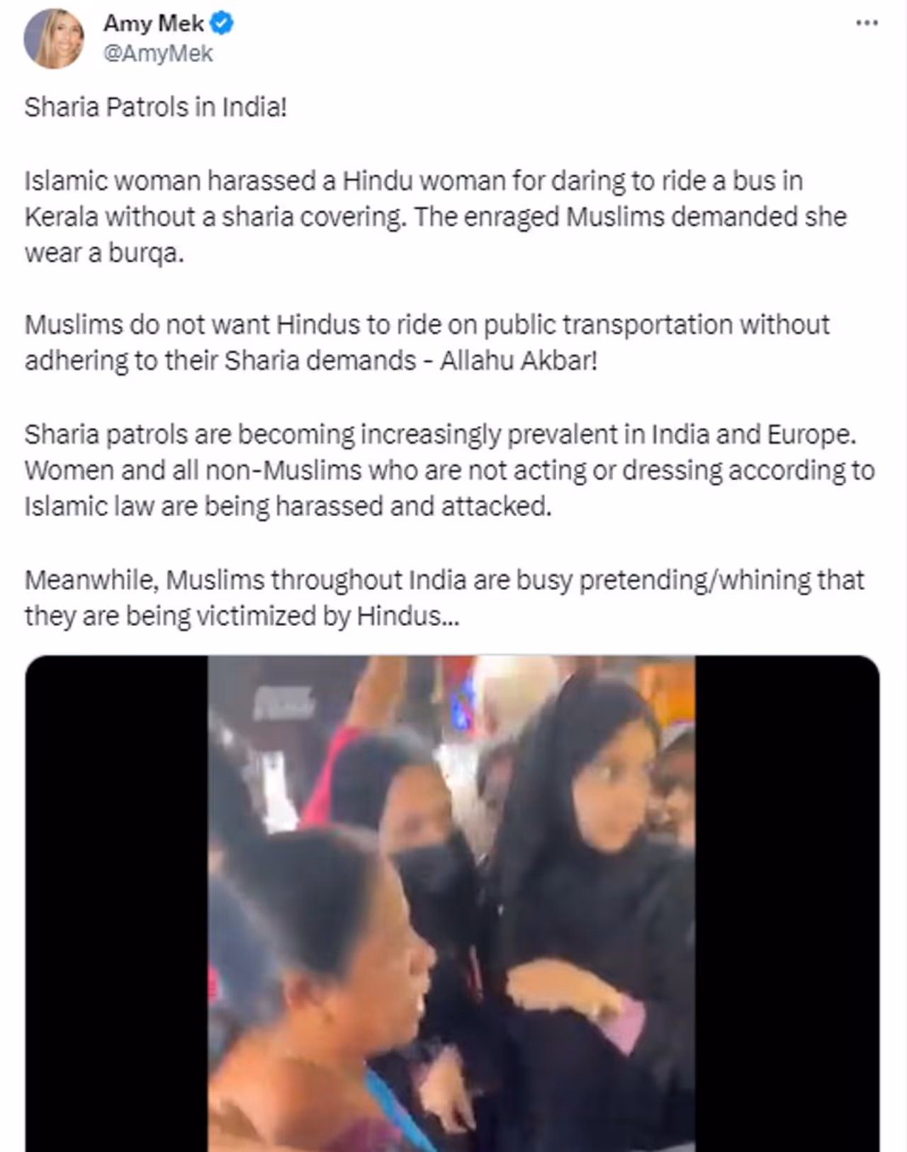 അനന്ദി നായർ എന്ന യൂസർ 2023 ഒക്ടോബർ 27-ാം തിയതി ട്വീറ്റ് ചെയ്ത വീഡിയോയില് കാണുന്നത് ബസിനുള്ളില് പർദയും ശിരോവസ്ത്രവും ധരിച്ച വിദ്യാർഥിനികളും സാരിയുടുത്ത മറ്റൊരു സ്ത്രീയും തമ്മില് വാക്കുതർക്കം നടക്കുന്നതായാണ്. ഇതിനെ കുറിച്ച് അനന്ദി നായരുടെ ട്വീറ്റ് ഇങ്ങനെ. 'ബുർഖ ധരിക്കാതെ ആരെയും ബസില് കയറാന് അനുവദിക്കില്ല എന്ന് മുസ്ലീം വനിതകള് പറയുകയാണ്. ഹിന്ദുക്കള്ക്ക് പൊതുഗതാഗത സംവിധാനത്തില് യാത്ര ചെയ്യണമെങ്കില് ഇപ്പോള് ശിരോവസ്ത്രം ധരിച്ച ശേഷം മാത്രമേ സാധിക്കൂ. ഇക്കാര്യം വാർത്താ മാധ്യമങ്ങളൊന്നും റിപ്പോർട്ട് ചെയ്യാത്തത് അമ്പരപ്പിക്കുന്ന കാര്യമാണ്. ഗോഡ്സ് ഓണ് കണ്ട്രി ഇപ്പോള് അള്ളാഹ് ഓണ് കണ്ട്രിയാണ്' എന്നുമുള്ള കുറിപ്പോടെയാണ് 51 സെക്കന്ഡ് ദൈർഘ്യമുള്ള വീഡിയോ അനന്ദി നായർ ട്വീറ്റ് ചെയ്തിരിക്കുന്നത്. ഈ വാർത്ത ചെയ്യുമ്പോള് 9 ലക്ഷത്തോളം പേർ ഈ വീഡിയോ ഒറ്റ ദിവസം കൊണ്ട് കണ്ടുകഴിഞ്ഞു.
