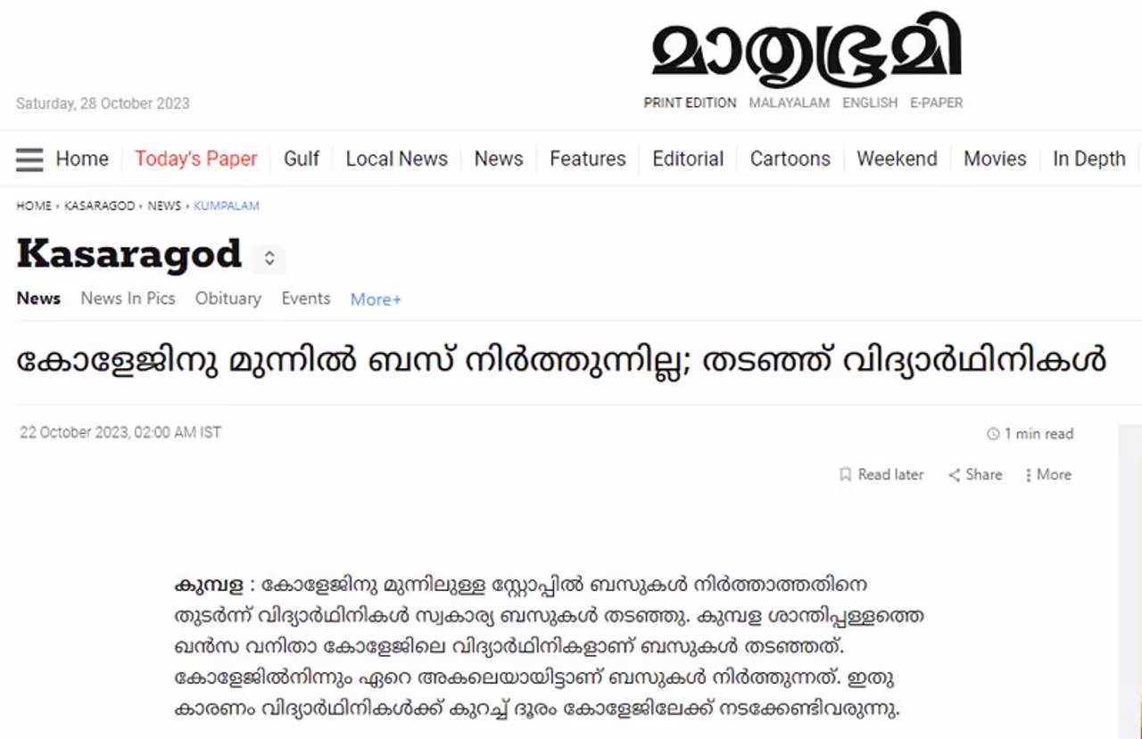 ബസ് കോളേജിന് മുന്നില് നിര്ത്തുന്നതുമായി ബന്ധപ്പെട്ട തര്ക്കമാണ് ഭാസ്ക്കര നഗറിൽ വിദ്യാര്ഥിനികളും ബസ് ജീവനക്കാരും തമ്മിലുണ്ടായത് എന്ന് അന്നത്തെ സംഭവത്തിന്റെ മാധ്യമവാര്ത്തകളില് നിന്ന് കാണാം. ഈ സംഭവത്തിന് വര്ഗീയ ചുവയുള്ളതായി മാധ്യമവാര്ത്തകളിലൊന്നും കാണാനില്ല. വാര്ത്തയുടെ സ്ക്രീന്ഷോട്ട് ചുവടെ.
