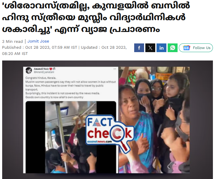 2023-ല് കാസര്കോട് ജില്ലയിലെ കുമ്പള-മുള്ളേരിയ കെഎസ്ടിപി റോഡിൽ ഭാസ്ക്കര നഗറിൽ ഖൻസ വനിത കോളേജിന് മുന്നില് ബസ് നിര്ത്തുന്നതുമായി ബന്ധപ്പെട്ട തര്ക്കത്തെ തുടര്ന്ന് വിദ്യാർഥിനികള് ബസ് തടഞ്ഞതായിരുന്നു വീഡിയോയ്ക്ക് ആധാരമായ സംഭവം. വിദ്യാർഥിനികള് ബസ് തടയുന്നതിന്റെ വീഡിയോ പിന്നാലെ വർഗീയച്ചുവയോടെ നിരവധിയാളുകള് എക്സില് പോസ്റ്റ് ചെയ്യുകയായിരുന്നു. മുസ്ലീം വിദ്യാര്ഥിനികളും സാരിയുടുത്ത ഒരു സ്ത്രീയും തമ്മില് ബസിനുള്ളില് വച്ച് വാക്കുതര്ക്കം നടക്കുന്നതായിരുന്നു വീഡിയോയിലുണ്ടായിരുന്നത്. എന്നാല് ഈ വീഡിയോ 2023 ഒക്ടോബറില് എക്സില് പ്രചരിക്കപ്പെട്ടതാവട്ടെ വര്ഗീയനിറം ചാര്ത്തിയും.