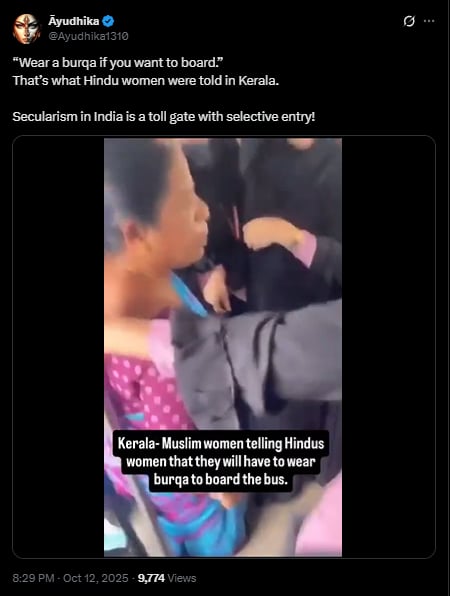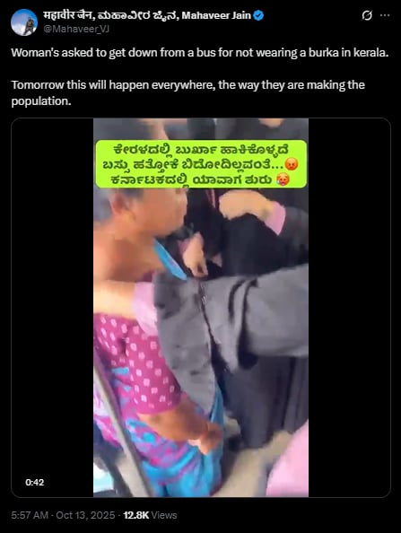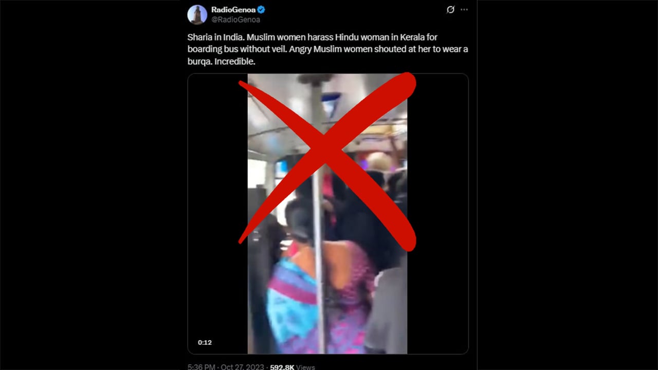 കേരളത്തില് ബുര്ഖ ധരിക്കാത്തതിനാല് ഹിന്ദു സ്ത്രീയെ ബസില് യാത്ര ചെയ്യാന് മുസ്ലീം വിദ്യാര്ഥിനികള് അനുവദിച്ചില്ല എന്ന തരത്തില് വീഡിയോ സഹിതമുള്ള പ്രചാരണം പൂര്ണമായും വ്യാജമാണ്. വടക്കേയിന്ത്യന് എക്സ് ഹാന്ഡിലുകള് നടത്തുന്നത് അപകടകരമായ വര്ഗീയ പ്രചാരണമാണ്.
