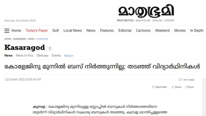 ബസിലെ തര്ക്കവുമായി ബന്ധപ്പെട്ട് 2023 ഒക്ടോബറില് വന്ന ഒരു വാര്ത്തയുടെ സ്ക്രീന്ഷോട്ട് ചുവടെ കാണാം. വീഡിയോയുടെ വസ്തുത ഈ വാര്ത്തയിലുണ്ട്.
