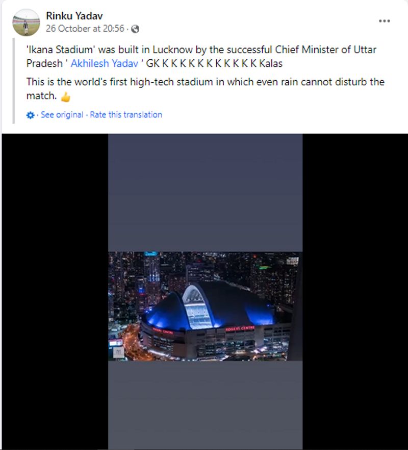 'ഉത്തര്പ്രദേശിലെ ലഖ്നൗവില് അഖിലേഷ് യാദവാണ് ഏകനാ സ്റ്റേഡിയം പണികഴിപ്പിച്ചത്. മഴ മത്സരം തടസപ്പെടുത്താത്ത തരത്തിലുള്ള ലോകത്തിലെ ആദ്യത്തെ ഹൈടെക് സ്റ്റേഡിയമാണിത്' എന്നുമാണ് റിങ്കു യാദവ് എന്നയാള് 2023 ഒക്ടോബര് 26-ാം തിയതി ഫേസ്ബുക്കില് പോസ്റ്റ് ചെയ്തിരിക്കുന്നത്. 9 സെക്കന്ഡ് ദൈര്ഘ്യമുള്ള ഒരു വീഡിയോ സഹിതമാണ് എഫ്ബി പോസ്റ്റ്. സ്റ്റേഡിയത്തിന്റെ മേല്ക്കൂരകള് അടയുന്ന ദൃശ്യങ്ങളാണ് ഈ വീഡിയോയിലുള്ളത്.