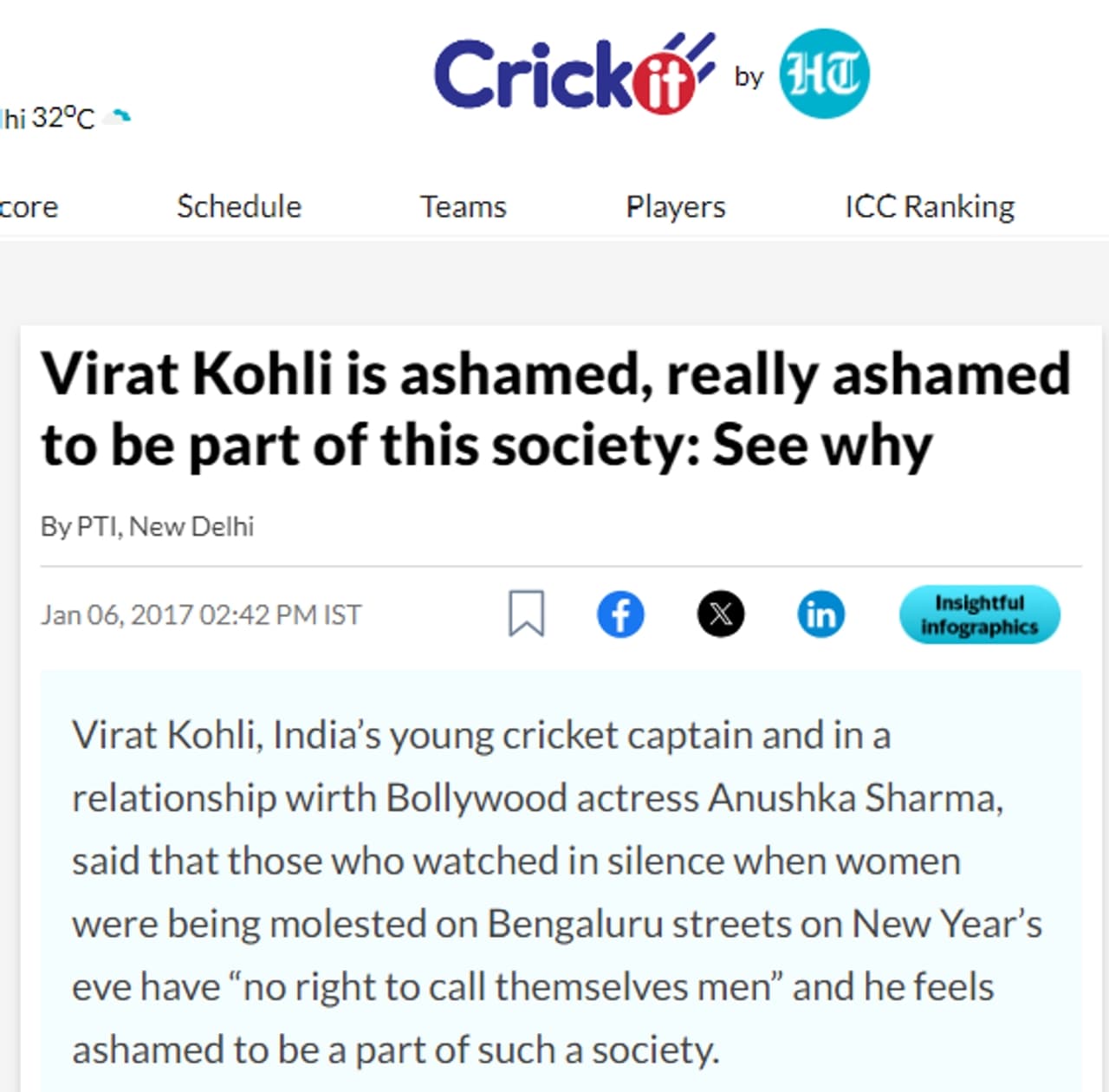 വിരാട് കോലിയുടെ വീഡിയോ കൊൽക്കത്തയിലെ ആർജി കർ മെഡിക്കൽ കോളേജിൽ യുവഡോക്ടർ അതിക്രൂര പീഡനത്തിന് ഇരയായി കൊല്ലപ്പെട്ടതിന് ശേഷം പുറത്തുവന്ന പ്രതികരണമല്ല എന്നതാണ് യാഥാര്ഥ്യം. ഈ വീഡിയോ പഴയതും 2017ലേതുമാണ്. 2017ലെ ന്യൂഇയര് രാത്രിയില് ബെംഗളൂരുവില് സ്ത്രീകള് അപമാനിക്കപ്പെട്ട സംഭവത്തില് കോലി നടത്തിയ പ്രതികരണമാണ് കൊല്ക്കത്ത കേസുമായി ബന്ധപ്പെടുത്തി പ്രചരിക്കുന്നത്. അന്ന് ഹിന്ദുസ്ഥാന് ടൈംസ് കോലിയുടെ വീഡിയോയെ കുറിച്ച് പ്രസിദ്ധീകരിച്ച വാര്ത്തയുടെ സ്ക്രീന്ഷോട്ട് ചുവടെ കാണാം.