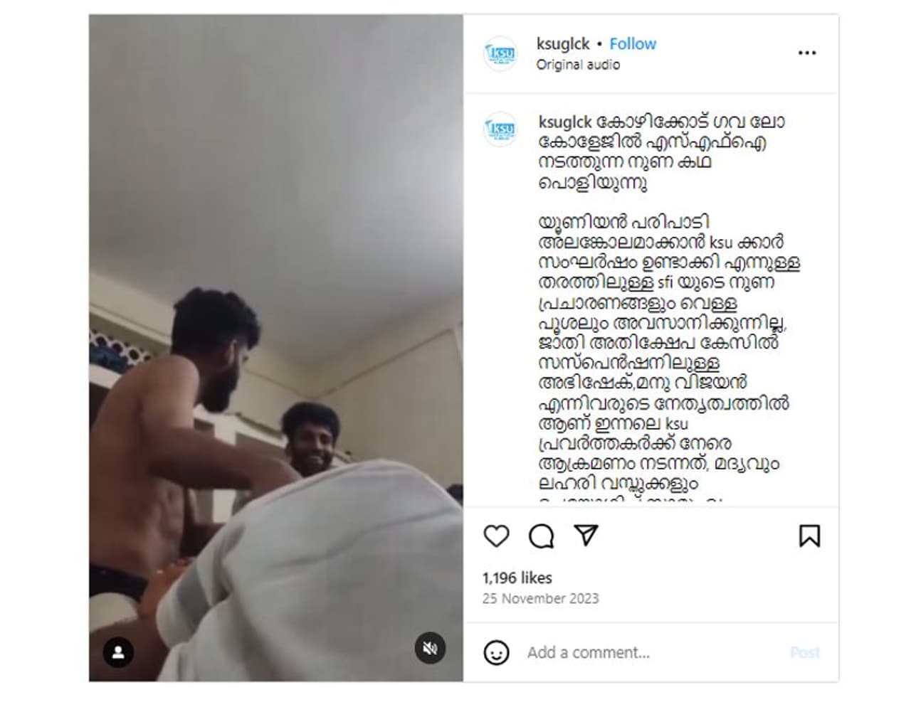 'യൂണിയൻ പരിപാടി അലങ്കോലമാക്കാൻ ksu ക്കാർ സംഘർഷം ഉണ്ടാക്കി എന്നുള്ള തരത്തിലുള്ള sfi യുടെ നുണ പ്രചാരണങ്ങളും വെള്ള പൂശലും അവസാനിക്കുന്നില്ല, ജാതി അതിക്ഷേപ കേസിൽ സസ്പെൻഷനിലുള്ള അഭിഷേക്,മനു വിജയൻ എന്നിവരുടെ നേതൃത്വത്തിൽ ആണ് ഇന്നലെ ksu പ്രവർത്തകർക്ക് നേരെ ആക്രമണം നടന്നത്, മദ്യവും ലഹരി വസ്തുക്കളും ഉപയോഗിച്ച് സാമൂഹ്യ വിപത്തുകൾ ആയിത്തീർന്ന ഇവരെ പോലെ ഉള്ളവരെയും അതിന് നേതൃത്വം കൊടുക്കുന്ന sfi എന്ന സംഘടനെയെയും ലോ കോളേജിലെ വിദ്യാർത്ഥികൾ തിരിച്ചറിയണം'- എന്ന കുറിപ്പോടെയാണ് കെഎസ്യു ഗവര്ണമെന്റ് ലോ കോളേജ് കോഴിക്കോട് എന്ന അക്കൗണ്ടില് നിന്ന് വീഡിയോ ഇന്സ്റ്റയില് പോസ്റ്റ് ചെയ്തിരിക്കുന്നത്.