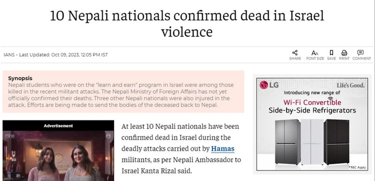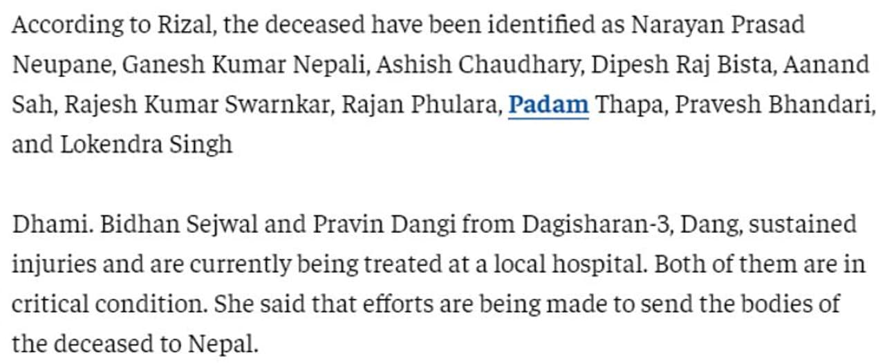എന്നാല് പട്ടികയിലുള്ള 17 പേരുടെയും വിലാസം പരിശോധിച്ചപ്പോള് അവയെല്ലാം നേപ്പാളിലെ സ്ഥലങ്ങളാണ് എന്ന് വ്യക്തമായി. ഈ സൂചന പ്രകാരം നടത്തിയ കീവേഡ് സെര്ച്ചില് നേപ്പാള് പൗരന്മാരുടെ സംബന്ധിച്ച വാര്ത്തയുടെ വിശദാംശങ്ങള് കണ്ടെത്താനായി. ഇസ്രയേല്-ഹമാസ് സംഘര്ഷത്തിനിടെ കൊല്ലപ്പെട്ടതും പരിക്കേറ്റതുമായ നേപ്പാള് പൗരന്മാരുടെ വാര്ത്ത ദേശീയ മാധ്യമമായ ദി ഇകണോമിക് ടൈംസ് റിപ്പോര്ട്ട് ചെയ്തിരുന്നു. ഇപ്പോള് എക്സില് പ്രചരിക്കുന്ന പട്ടികയിലുള്ള പേരുകള് ഇക്കണോമിക് ടൈംസിന്റെ വാര്ത്തയില് കാണാം. തങ്ങളുടെ 10 പൗരന്മാര് കൊല്ലപ്പെട്ടതായി നേപ്പാള് വിദേശകാര്യ മന്ത്രാലയം വാര്ത്താകുറിപ്പിലൂടെ അറിയിച്ചിരുന്നു. ഇതിനാല്തന്നെ ഇപ്പോള് പ്രചരിക്കുന്ന പട്ടിക നേപ്പാള് പൗരന്മാരുടെതാണ് എന്ന് ഉറപ്പിക്കാം.