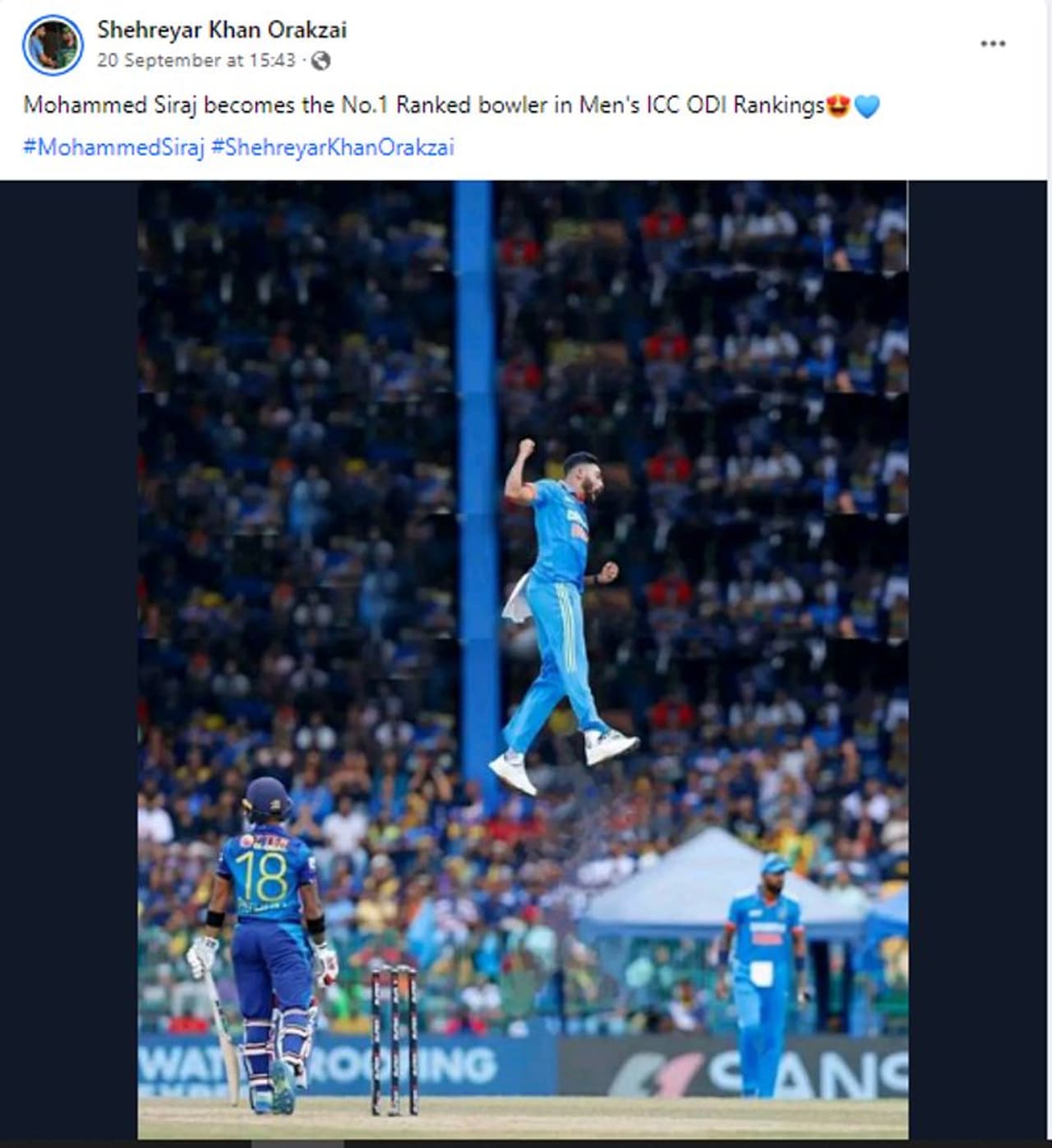 ലങ്കയുടെ ആറ് വിക്കറ്റുകളുമായി മുഹമ്മദ് സിറാജ് കത്തിപ്പടര്ന്നതിന് പിന്നാലെയായിരുന്നു സാമൂഹ്യമാധ്യമങ്ങളില് ആ ചിത്രമെത്തിയത്. ലങ്കന് ബാറ്ററെ പുറത്താക്കിയ ശേഷം ചാടിയുയര്ന്ന സിറാജ് വാനോളം ഉയര്ന്നു എന്നായിരുന്നു ചിത്രം സഹിതമുള്ള പ്രചാരണം. അതിശയത്തോടെ പലരും ഈ ചിത്രം ഷെയര് ചെയ്തിരിക്കുന്നത് കാണാം. ഒരിക്കലും സാധാരണ ഒരു മനുഷ്യന് സങ്കല്പിക്കാന് കഴിയാത്തത്ര ഉയരമുണ്ടായിരുന്നു സിറാജിന്റെ ഈ ചാട്ടത്തിന്. ക്രിസ്റ്റ്യാനേ റൊണാള്ഡോയുടെ റെക്കോര്ഡ് ഹെഡര് ചാട്ടം പോലും ഇതിന് മുന്നില് ഒന്നുമല്ല എന്നാണ് ചിത്രം കണ്ടാല് തോന്നുക. അതിനാല് തന്നെ ഈ ചിത്രം സത്യമാണോ എന്ന് പരിശോധിക്കേണ്ടതുണ്ട്.