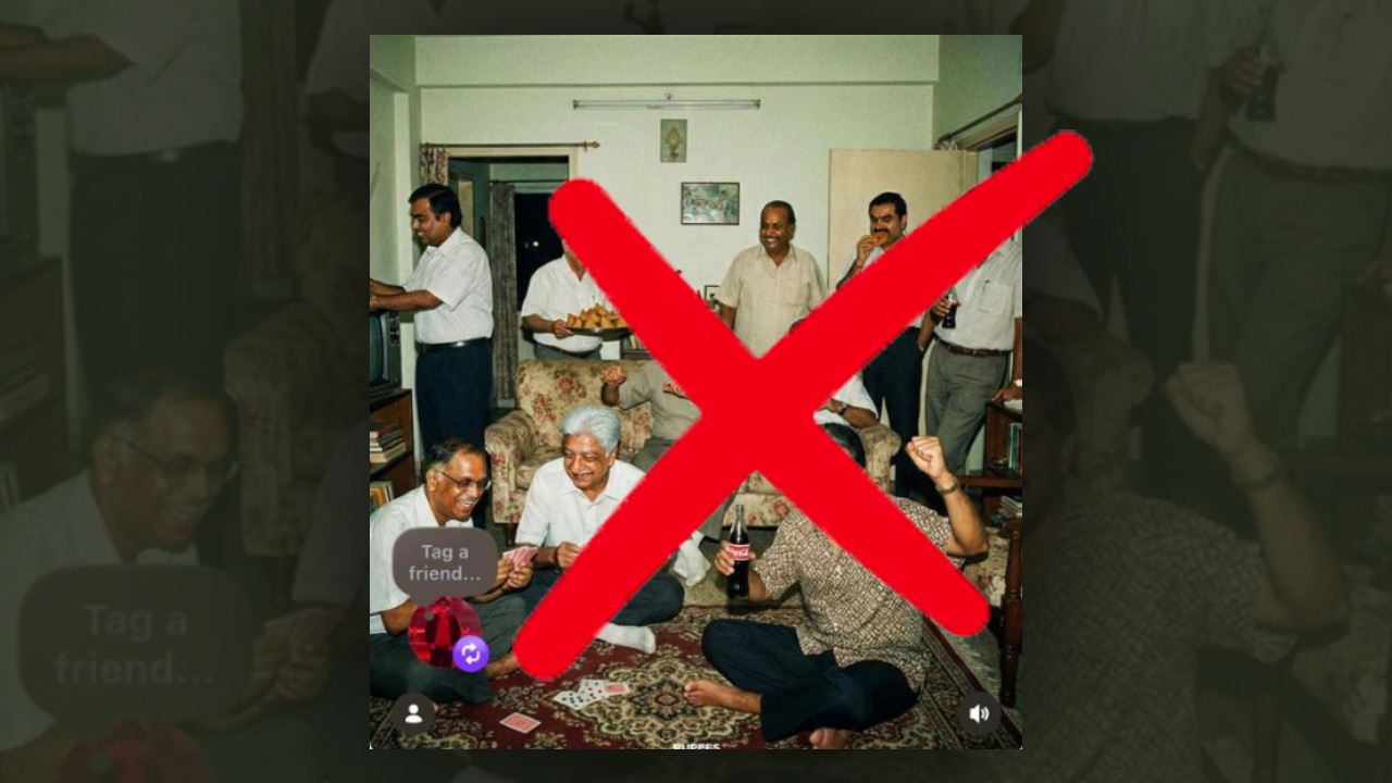 രത്തൻ ടാറ്റ, ധിരുഭായ് അംബാനി, നാരായണ മൂർത്തി, ഗൗതം അദാനി തുടങ്ങി രാജ്യത്തെ ബിസിനസ്സ് പ്രമുഖര് ഒരുമിച്ചിരിക്കുന്ന ചിത്രം യഥാര്ഥമല്ല. ആര്ട്ടിഫിഷ്യല് ഇന്റലിജന്സ് ടൂളുകളുടെ സഹായത്തോടെ തയ്യാറാക്കിയ ചിത്രമാണ് യഥാര്ഥമെന്ന വ്യാജേന സമൂഹ മാധ്യമങ്ങളില് നിരവധി പേര് ഷെയര് ചെയ്യുന്നത്.