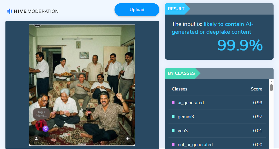 രത്തൻ ടാറ്റ, ധിരുഭായ് അംബാനി, നാരായണ മൂർത്തി, ഗൗതം അദാനി തുടങ്ങിയ രാജ്യത്തെ ബിസിനസ് അധികായര് ഒന്നിച്ചുള്ള ഈ ചിത്രത്തിന്റെ വസ്തുത തിരയാന് കീവേഡ് സെര്ച്ച് നടത്തിയെങ്കിലും ഫോട്ടോയേയോ കൂടിക്കാഴ്ചയേയോ കുറിച്ച് ആധികാരികമായ വാര്ത്തകളൊന്നും ലഭ്യമായില്ല. ഇതൊരു സ്വകാര്യ കൂടിക്കാഴ്ചയുടെ ചിത്രമാണോ എന്ന് കണ്ടെത്താനും സാധിച്ചില്ല. വൈറല് ഫോട്ടോ റിവേഴ്സ് ഇമേജ് സെര്ച്ച് മാര്ഗത്തിലൂടെ പരിശോധിച്ചപ്പോഴും മതിയായ വിവരങ്ങള് ഇന്റര്നെറ്റില് നിന്ന് കിട്ടിയില്ല. ഇതോടെ, ഈ ഫോട്ടോ എഐ നിര്മ്മിതമാണോ എന്ന സംശയം ബലപ്പെട്ടു. ഇതേത്തുടര്ന്ന്, ഈ ഫോട്ടോ എഐ ഡിറ്റക്ഷന് ടൂളുകള് ഉപയോഗിച്ച് പരിശോധനയ്ക്ക് വിധേയമാക്കി. ഈ പരിശോധനയിലെ മിക്ക ഫലങ്ങളും പറഞ്ഞത് ഈ ഫോട്ടോയൊരു എഐ സൃഷ്ടിയാണ് എന്നാണ്.
