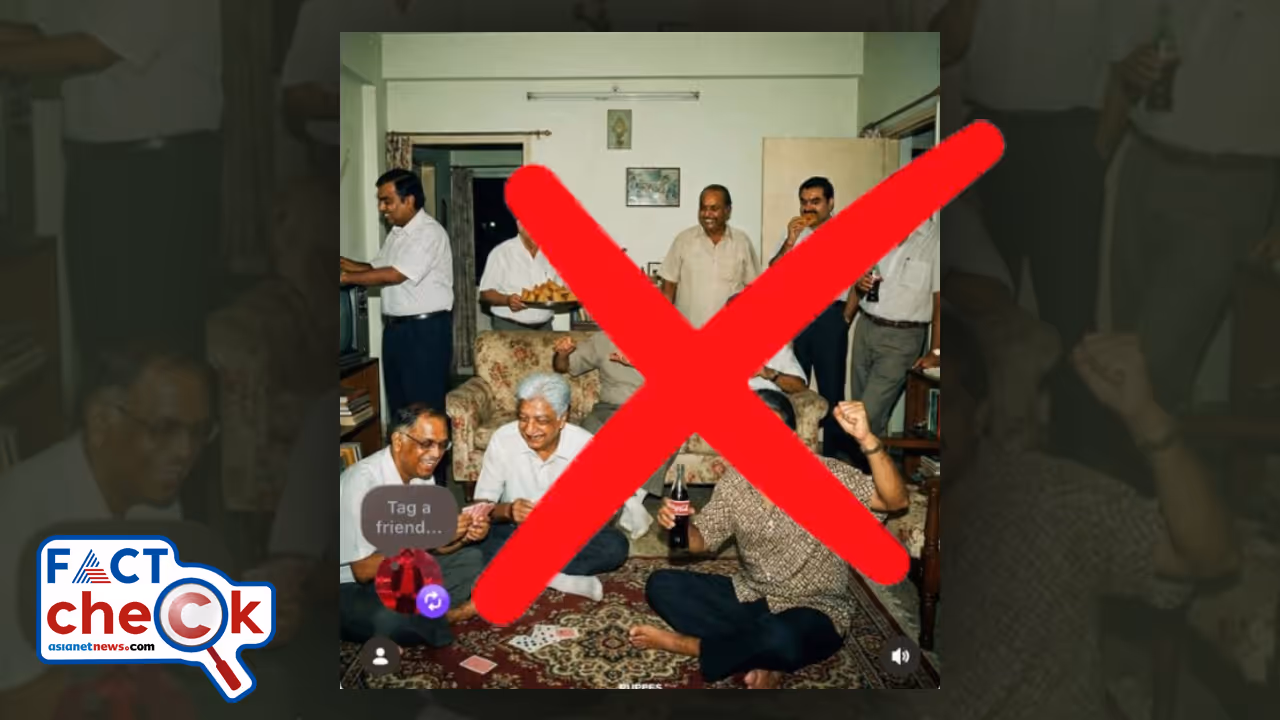 രത്തൻ ടാറ്റ, ധിരുഭായ് അംബാനി, നാരായണ മൂർത്തി, ഗൗതം അദാനി തുടങ്ങി രാജ്യത്തെ ബിസിനസ്സ് പ്രമുഖര് ഒരുമിച്ചിരുന്ന് ഭക്ഷണം കഴിക്കുന്നതായി ഒരു ചിത്രം സോഷ്യല് മീഡിയയില് വൈറലാണ്. ഇവര് ചീട്ടുകളിക്കുന്നതും, പാനീയങ്ങളും ലഘു ഭക്ഷണങ്ങളും കഴിക്കുന്നതുമാണ് വൈറല് ഫോട്ടോയില് കാണുന്നത്. യഥാര്ഥ ഫോട്ടോ എന്ന് പറയപ്പെടുന്ന ഈ ചിത്രം സത്യമോ? ഏറെ പഴക്കം തോന്നിക്കുന്ന ഈ ചിത്രത്തിലേതുപോലെയൊരു കൂടിക്കാഴ്ച ഈ ബിസിനസ് വമ്പന്മാര് തമ്മില് സാധ്യമായിരുന്നോ എന്ന ചോദ്യം സോഷ്യല് മീഡിയയില് സജീവമായിരിക്കേ വസ്തുത പരിശോധിക്കാം.