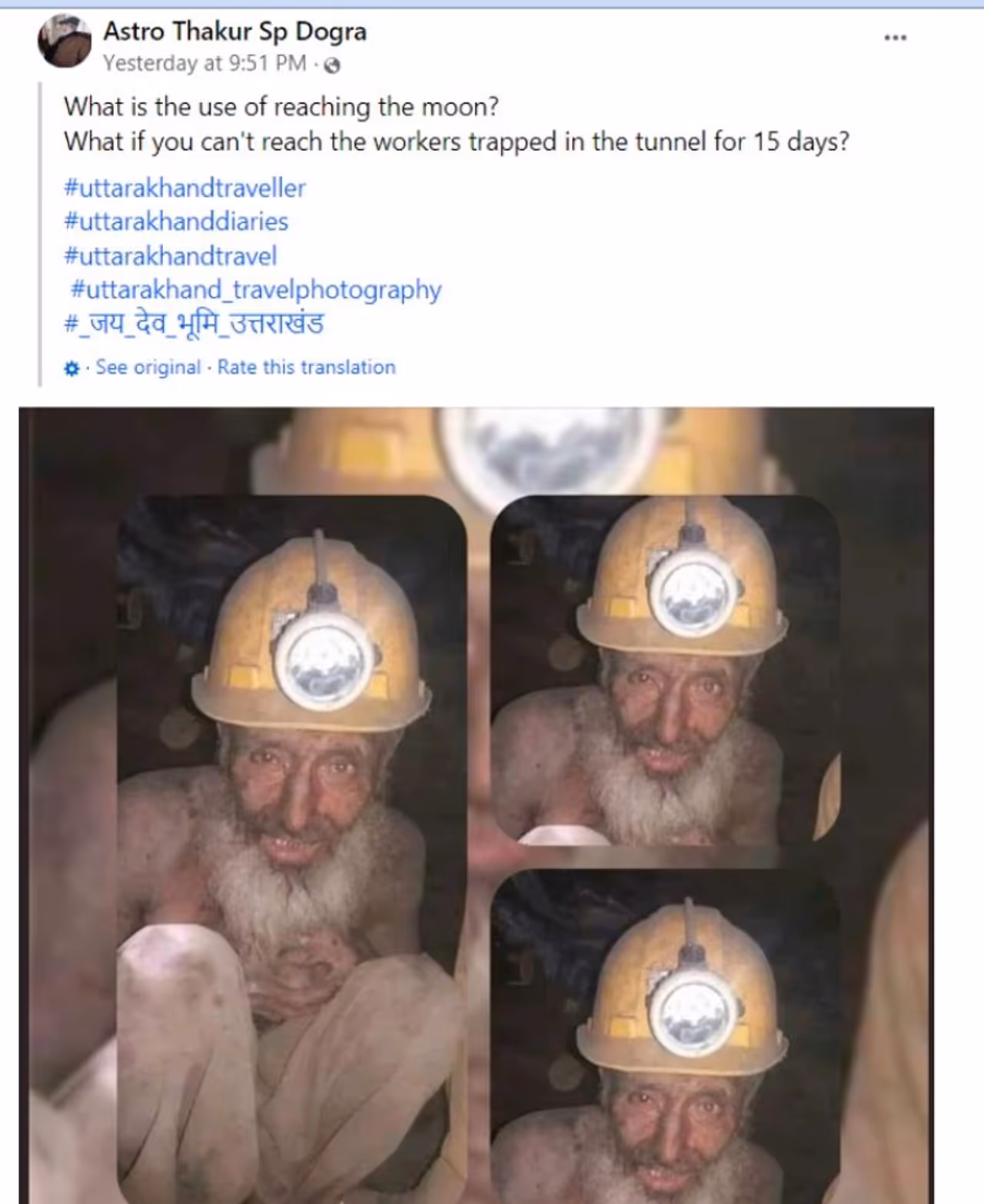 ഉത്തരാഖണ്ഡിലെ സിൽക്യാരയിൽ ടണൽ നിർമാണത്തിനിടെ കുടുങ്ങിയ 41 തൊഴിലാളികളില് ഒരാളുടേത് എന്ന പേരിൽ പ്രചരിക്കുന്ന ചിത്രം വ്യാജം. വയോധികനായ ഒരു മനുഷ്യന്റെ ചിത്രമാണ് സാമൂഹ്യമാധ്യമങ്ങളിൽ പ്രചരിക്കുന്നത്. എന്നാൽ ഈ ചിത്രം 2019 മുതൽ ഇന്റര്നെറ്റിൽ കാണാം. സാമൂഹ്യമാധ്യമങ്ങളില് നടക്കുന്ന പ്രചാരണത്തെ കുറിച്ച് വിശദമായി അറിയാം.