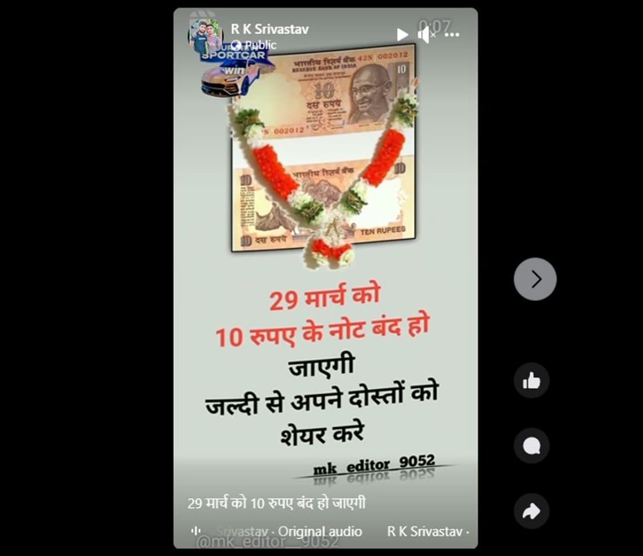 '10 രൂപ നോട്ടുകള് മാര്ച്ച് 29ഓടെ പിന്വലിക്കപ്പെടും'- ആര്കെ ശ്രീവാസ്തവ് എന്നയാള് ഫേസ്ബുക്ക് റീല്സായി പങ്കുവെച്ച വീഡിയോയിലാണ് ഇക്കാര്യം പറയുന്നത്. പഴയ പത്ത് രൂപ നോട്ടാണ് വീഡിയോയില് കാണുന്നത്. ഇക്കാര്യം സത്യമാണോ എന്ന് പരിശോധിക്കാം.