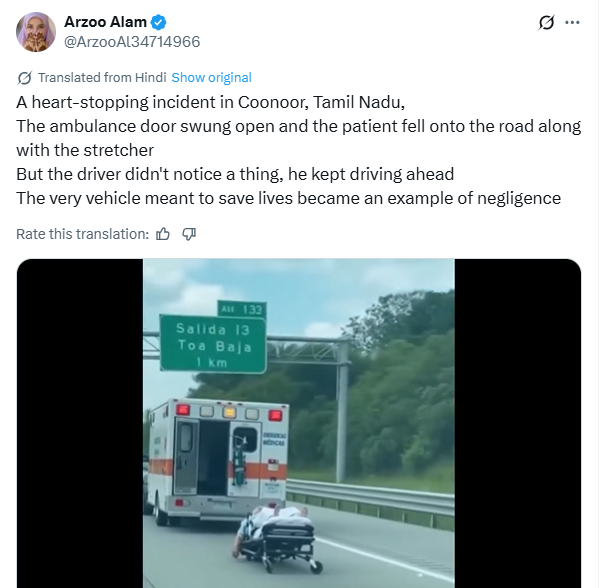 ഓടിക്കൊണ്ടിരിക്കുന്ന ഒരു ആംബുലന്സിന്റെ പിന്വാതില് നിന്നും രോഗി സ്ട്രെച്ചർ സഹിതം റോഡിലേക്ക് വീഴുന്ന ദൃശ്യങ്ങള് സോഷ്യല് മീഡിയ പ്ലാറ്റ്ഫോമായ എക്സില് വൈറലാണ്. തമിഴ്നാട്ടില് നിന്നുള്ള വീഡിയോ എന്ന അവകാശവാദത്തോടെ അനവധി പേരാണ് 15 സെക്കന്ഡ് ദൈര്ഘ്യമുള്ള ഈ വീഡിയോ എക്സില് പോസ്റ്റ് ചെയ്തിരിക്കുന്നത്.