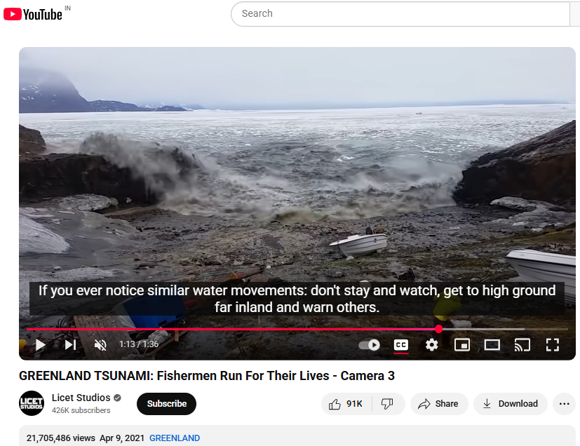 എക്സില് നിരവധി യൂസര്മാര് പോസ്റ്റ് ചെയ്തിരിക്കുന്ന വീഡിയോ റഷ്യന് ഭൂകമ്പത്തെ തുടര്ന്നുണ്ടായ സുനാമിയുടേത് അല്ലെന്ന് പലരും കമന്റുകള് രേഖപ്പെടുത്തിയതായി കാണാം. വീഡിയോ ഗ്രീന്ലന്ഡില് നിന്നുള്ളതാണ് എന്ന് പലരും സൂചിപ്പിച്ചിട്ടുമുണ്ട്. ഇതേത്തുടര്ന്ന് നടത്തിയ കീവേഡ് സെര്ച്ചില് വീഡിയോയുടെ ഒറിജിനല് കണ്ടെത്താനും ദൃശ്യങ്ങള് പഴയതാണെന്നും ഉറപ്പിക്കാനായി. റഷ്യയില് നിന്നുള്ളത് എന്ന കുറിപ്പുകളില് ഇപ്പോള് എക്സില് വൈറലായിരിക്കുന്ന അതേ വീഡിയോ 2021 ഏപ്രില് 9ന് Licet Studios എന്ന യൂട്യൂബ് ചാനലില് പോസ്റ്റ് ചെയ്തിരുന്നതാണ്. അതിന്റെ സ്ക്രീന്ഷോട്ട് ചുവടെ കാണാം. ഗ്രീന്ലന്ഡ് സുനാമി എന്ന തലക്കെട്ടിലാണ് നാല് വര്ഷം മുമ്പ് ഈ വീഡിയോ യൂട്യൂബില് പബ്ലിഷ് ചെയ്തത്. അതിനാല്, ഇപ്പോള് റഷ്യയിലേത് എന്ന പേരില് വൈറലായിരിക്കുന്ന വീഡിയോ പഴയതാണെന്നും, ഗ്രീന്ലന്ഡില് നിന്നുള്ളതുമാണ് എന്നുമാണ് മനസിലാക്കേണ്ടത്.