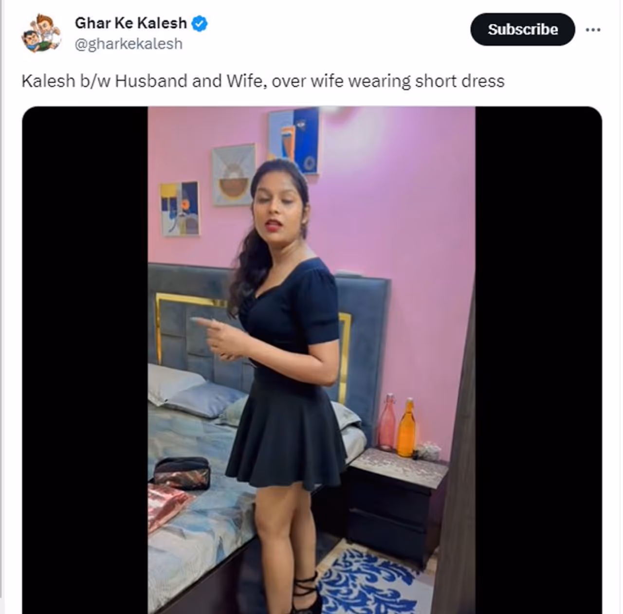 ഭാര്യ ഇറക്കം കുറഞ്ഞ വസ്ത്രം ധരിക്കുന്നതിനെ ചൊല്ലി ഭര്ത്താവും ഭാര്യയും തമ്മില് നടക്കുന്ന തര്ക്കം എന്ന തലക്കെട്ടോടെയാണ് വീഡിയോ Ghar Ke Kalesh എന്ന ട്വിറ്റര് യൂസര് പോസ്റ്റ് ചെയ്തിരിക്കുന്നത്. 2023 നവംബര് 14 രാവിലെ 11.07ന് ട്വീറ്റ് ചെയ്ത വീഡിയോ വാര്ത്ത പ്രസിദ്ധീകരിക്കുമ്പോഴേക്ക് ഇതിനകം രണ്ട് ലക്ഷത്തിലധികം പേരാണ് കണ്ടത്. നിരവധി ആളുകള് വീഡിയോ റീ-ട്വീറ്റ് ചെയ്യുകയും ചെയ്തിട്ടുണ്ട്. 51 സെക്കന്ഡാണ് വീഡിയോയുടെ ദൈര്ഘ്യം. എന്നാല് വീഡിയോയില് തര്ക്കിക്കുന്ന പുരുഷന്റെ ദൃശ്യങ്ങള് കാണിക്കുന്നില്ല, സ്ത്രീയുടെ വീഡിയോ മാത്രമേയുള്ളൂ. 'എന്ത് വസ്ത്രമാണിത്' എന്ന് യുവതിയോട് പുരുഷന് ചോദിക്കുന്നത് കേള്ക്കാം.