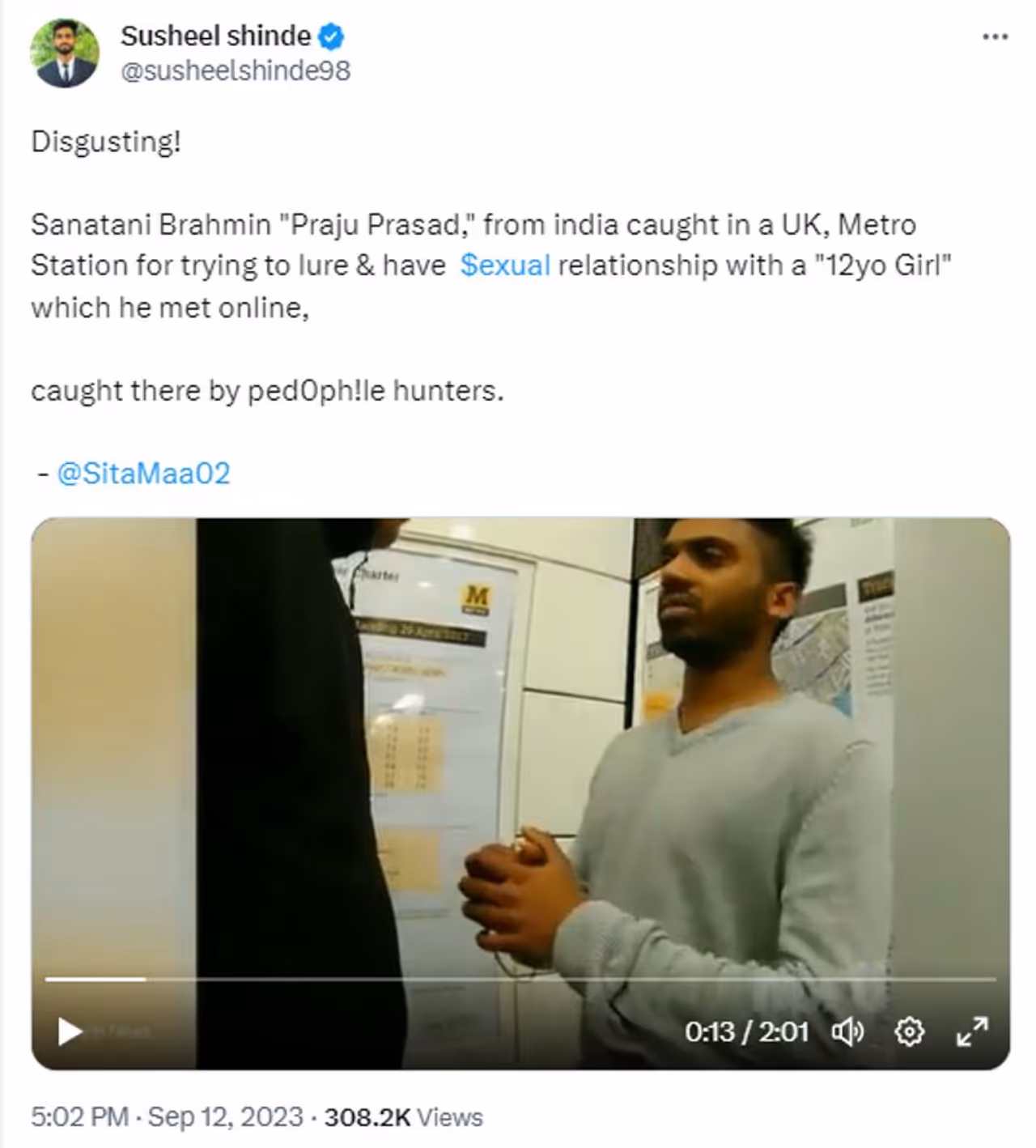 'ഓണ്ലൈന് വഴി പരിചയപ്പെട്ട 12 വയസ് മാത്രമുള്ള പെണ്കുട്ടിയോട് ലൈംഗികബന്ധത്തിന് ശ്രമിച്ച ഇന്ത്യയില് നിന്നുള്ള പ്രജു പ്രസാദ് യുകെ മെട്രോയില് വച്ച് പിടിയിലായി. യുകെയിലെ പീഡോഫൈല് ഹണ്ടേഴ്സാണ് ഇയാളെ പിടികൂടിയത്' എന്നുമാണ് വീഡിയോ ഷെയര് ചെയ്തുകൊണ്ട് സുശീല് ഷിണ്ഡെ എന്നയാള് ട്വിറ്ററില് കുറിച്ചിരിക്കുന്നത്. പിടികൂടിയ പൊലീസുകാരോട് ഇയാള് കാലില് പിടിച്ച് മാപ്പിരക്കാന് ശ്രമിക്കുന്നതും വീഡിയോയിലുണ്ട്. 'ഇന്ത്യന് വംശജനായ റിഷി സുനക് യുകെ പ്രധാനമന്ത്രിയായതോടെ ചിലര് കരുതിയിരിക്കുന്നത് യുകെ അഖണ്ഡ ഭാരത്തിന്റെ ഭാഗമാണ്' എന്ന കുറിപ്പോടെ മറ്റൊരാളും വീഡിയോ പങ്കുവെച്ചിരിക്കുന്നത് കാണാം. ഇത്തരത്തില് നിരവധി പേര് വീഡിയോ ട്വീറ്റ് ചെയ്തിരിക്കുന്നത് എക്സില്(ട്വിറ്റര്) കാണാം.