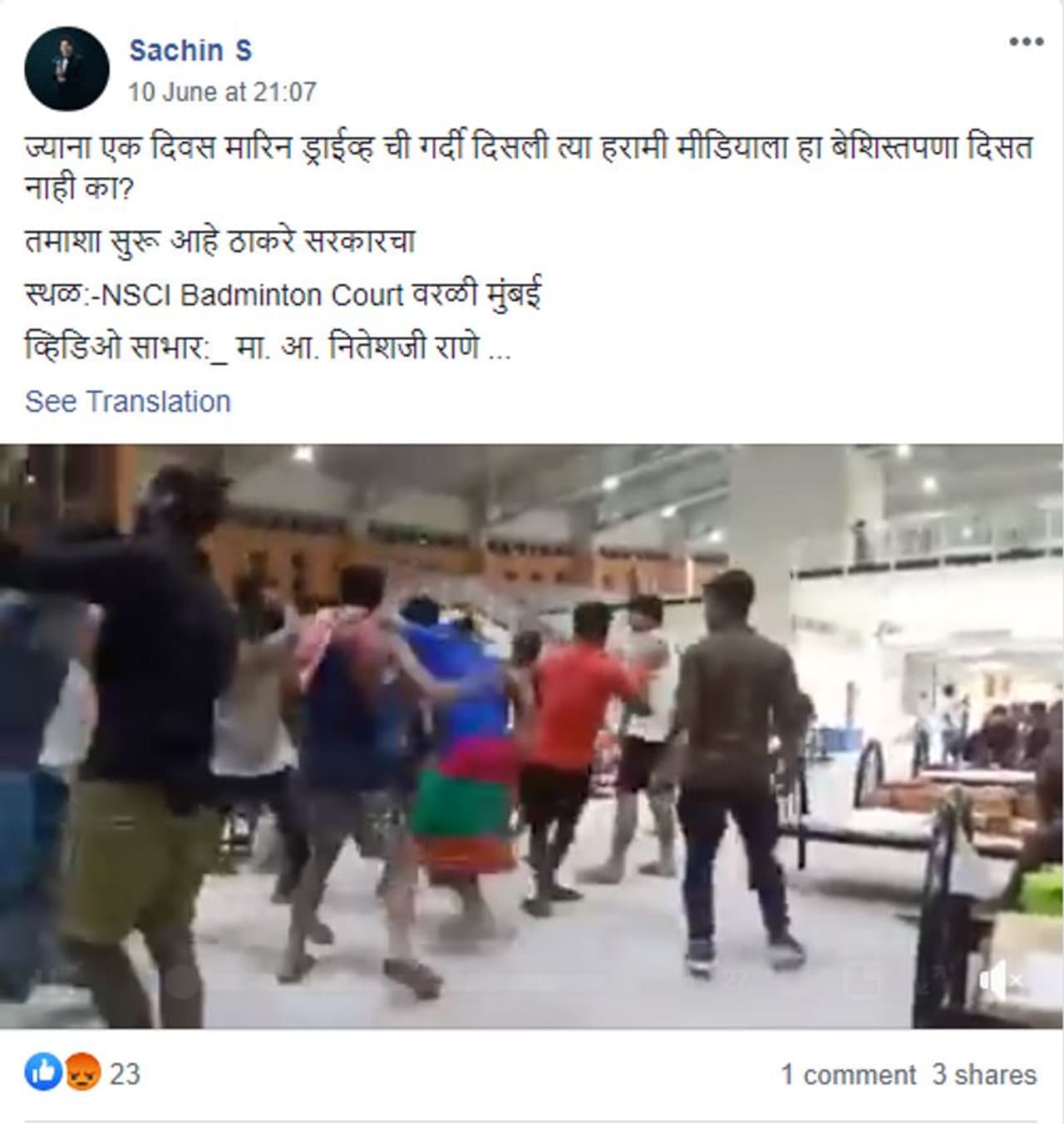 ക്വാറന്റീന് കേന്ദ്രത്തിലെ ലുങ്കി ഡാന്സ് എന്ന പേരില് 29 സെക്കന്റ് വീഡിയോയാണ് സാമൂഹ്യമാധ്യമങ്ങളില് പ്രചരിക്കുന്നത്. മുംബൈയിലുള്ള നാഷണല് സ്പോര്ട്സ് ക്ലബ് ഓഫ് ഇന്ത്യയുടെ(NSCI) ബാഡ്മിന്റണ് കോര്ട്ടിലാണ് സംഭവം എന്നാണ് ഒരു ഫേസ്ബുക്ക് പോസ്റ്റില് പറയുന്നത്. എന്എസ്സിഐയുടെ ഒരുഭാഗം ക്വാറന്റീന് സൗകര്യത്തിനായി ഉപയോഗിച്ചുവരുന്നുണ്ട്. അതേസമയം, ചെന്നൈയില് നിന്നും ബാംഗാളില് നിന്നുമുള്ളതാണ് വീഡിയോ എന്ന വാദവും സാമൂഹ്യമാധ്യമങ്ങളിലുണ്ട്.