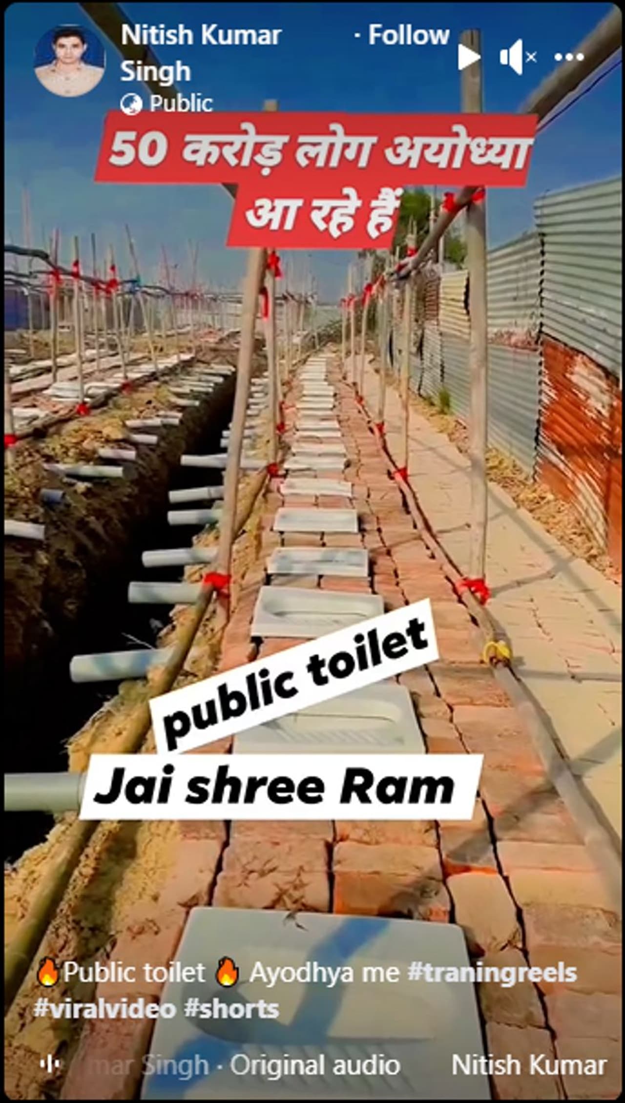 അയോധ്യയില് രാമക്ഷേത്ര സന്ദര്ശനത്തിനെത്തുന്ന തീര്ഥാടകര്ക്ക് വേണ്ടി തയ്യാറാക്കുന്ന ടോയ്ലറ്റ് സൗകര്യങ്ങള് എന്ന കുറിപ്പോടെയാണ് വീഡിയോ സാമൂഹ്യമാധ്യമങ്ങളില് പങ്കുവെയ്ക്കപ്പെടുന്നത്. ഇത്തരത്തില് ഫേസ്ബുക്കിലും, എക്സിലും പോസ്റ്റ് ചെയ്യപ്പെട്ട രണ്ട് വീഡിയോകള് ചുവടെ കാണാം.
