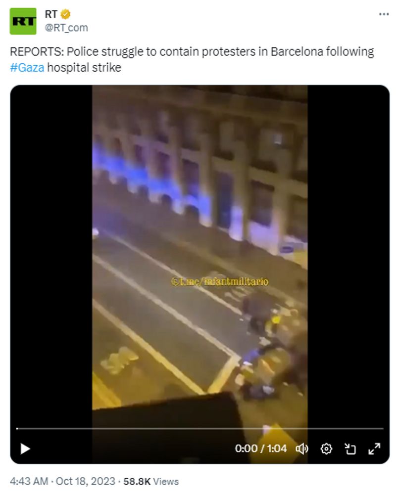 റഷ്യ ടുഡെ (RT) അടക്കമുള്ള വിവിധ രാജ്യാന്തര മാധ്യമങ്ങളുടെ വെരിഫൈഡ് അക്കൗണ്ടുകളില് നിന്നടക്കം പ്രത്യക്ഷപ്പെട്ട വീഡിയോയാണിത്. സ്പെയിനിലെ ബാഴ്സലോണയുടെ തെരുവുകളില് പലസ്തീന് അനുകൂലികളും പൊലീസും തമ്മില് ഏറ്റുമുട്ടി എന്ന തലക്കെട്ടുകളോടെയാണ് വീഡിയോ നിരവധി അക്കൗണ്ടുകള് ട്വിറ്ററില് (എക്സ്) പങ്കുവെച്ചിരിക്കുന്നത്. 2023 ഒക്ടോബര് 18-ാം തിയതിയാണ് റഷ്യ ടുഡെ വീഡിയോ ട്വീറ്റ് ചെയ്തത്. ഗാസയിലെ ആശുപത്രി ആക്രമണത്തിന് ശേഷമാണ് ബാഴ്സലോണയില് പ്രതിഷേധമുണ്ടായത് എന്നും റഷ്യ ടുഡെയുടെ ട്വീറ്റിലുണ്ട്.
