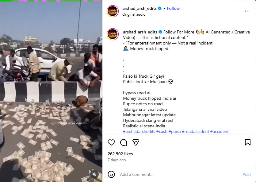 മറിഞ്ഞ ട്രക്കില് നിന്നുള്ള പണം കൈക്കലാക്കാന് ആളുകള് തടിച്ചുകൂടിയതായുള്ള വീഡിയോ യഥാര്ഥമല്ല, എഐ ജനറേറ്റഡ് വീഡിയോയാണ് സോഷ്യല് മീഡിയയില് പ്രചരിക്കുന്നത്.