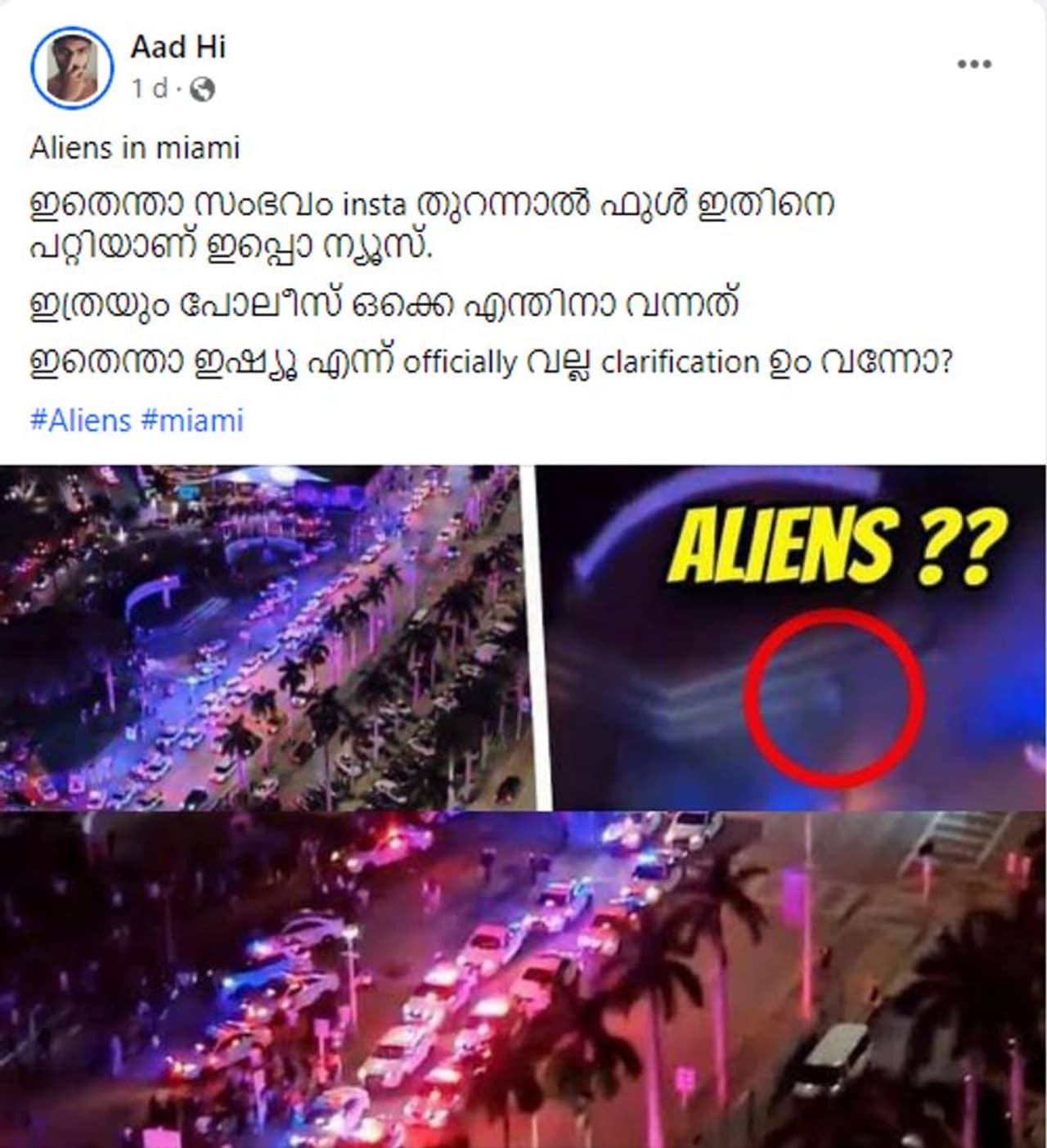 ഇംഗ്ലീഷില് മാത്രമല്ല, മലയാളത്തിലുള്ള തലക്കെട്ടുകളോടെ കേരളത്തിലും മയാമിയില് നിന്നുള്ള വീഡിയോകളും ചിത്രങ്ങളും ചര്ച്ചയായി. Aad Hi എന്ന യൂസര് 2024 ജനുവരി 8-ാം തിയതി ഫേസ്ബുക്കില് ഒരു കൊളാഷിനൊപ്പം പങ്കുവെച്ച കുറിപ്പ് ചുവടെ കൊടുത്തിരിക്കുന്നു. വൈറല് വീഡിയോയില് നിന്നെടുത്ത സ്ക്രീന്ഷോട്ടുകളാണ് ഈ പോസ്റ്റില് ചേര്ത്തിരിക്കുന്നത്.