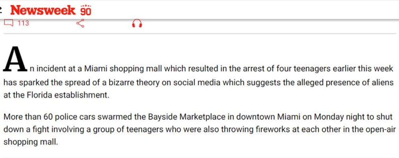 അന്യഗ്രഹജീവികളെ കുറിച്ചല്ല, ഒരുകൂട്ടം കൗമാരക്കാരുടെ വിചിത്രമായ ഒരു നടപടിയെ കുറിച്ചാണ് ഈ വാര്ത്തയില് വിവരിക്കുന്നത്. മയാമിയിലെ തുറസായ ഷോപ്പിംഗ് മാളിലെത്തി പരസ്പരം പടക്കം കത്തിച്ചെറിഞ്ഞും സംഘര്ഷമുണ്ടാക്കിയും ഭീകരാന്തരീക്ഷം സൃഷ്ടിച്ച സംഭവത്തില് നാല് കൗമാരക്കാതെ അറസ്റ്റ് ചെയ്തതായി വാര്ത്തയില് വിശദീകരിക്കുന്നു. ഫേസ്ബുക്കില് Aad Hi എന്ന യൂസര് പോസ്റ്റ് ചെയ്തിരിക്കുന്ന കൊളാഷിലെ ചിത്രങ്ങള് ന്യൂസ്വീക്കിന്റെ വാര്ത്തയിലും കാണാം. സംഭവസ്ഥലം ശാന്തമാക്കാന് അറുപതിലധികം പൊലീസ് കാറുകളാണ് മാളിനടുത്തേക്ക് പാഞ്ഞെത്തിയത് എന്നും വാര്ത്തയില് വിശദീകരിക്കുന്നു.