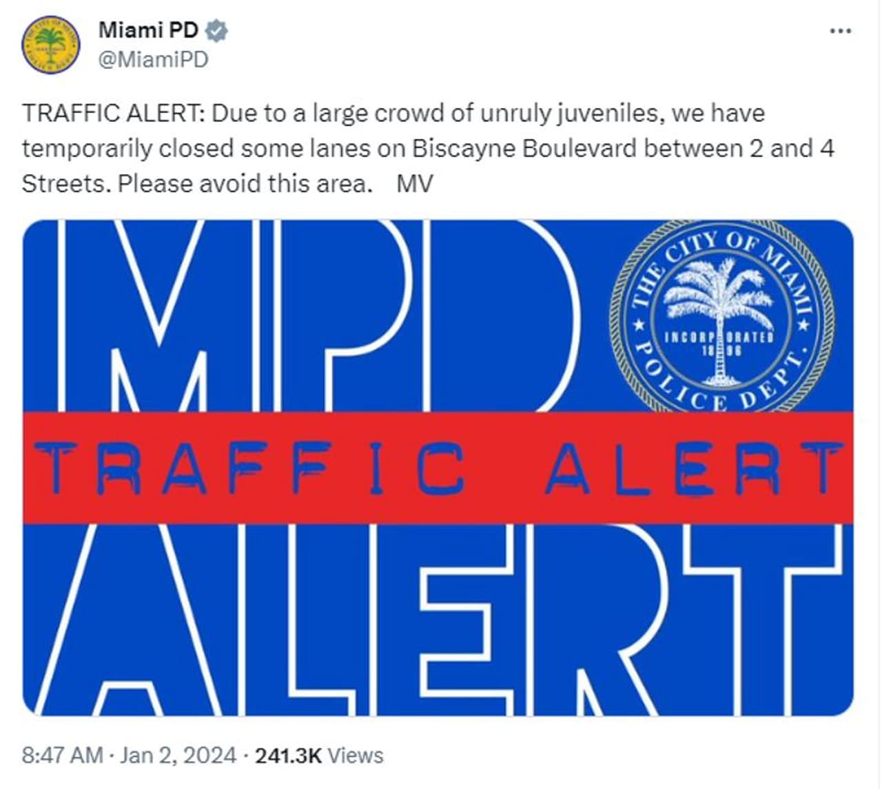 സംഭവദിവസമായ 2024 ജനുവരി രണ്ടിന് മാളിന് സമീപത്തുള്ള റോഡുകളില് ഗതാഗത നിയന്ത്രണം ഏര്പ്പെടുത്തിയതായി മയാമി പൊലീസ് ഔദ്യോഗിക ട്വിറ്റര് ഹാന്ഡിലിലൂടെ പൊതുജനങ്ങളെ അറിയിച്ചിരുന്നു എന്നും പരിശോധനയില് വ്യക്തമായി. ഈ ട്വീറ്റിന് താഴെ, മയാമി ഷോപ്പിംഗ് മാളില് എന്താണ് നടന്നത് എന്ന് ആളുകള് തിരക്കിയിരിക്കുന്നത് കാണാം.