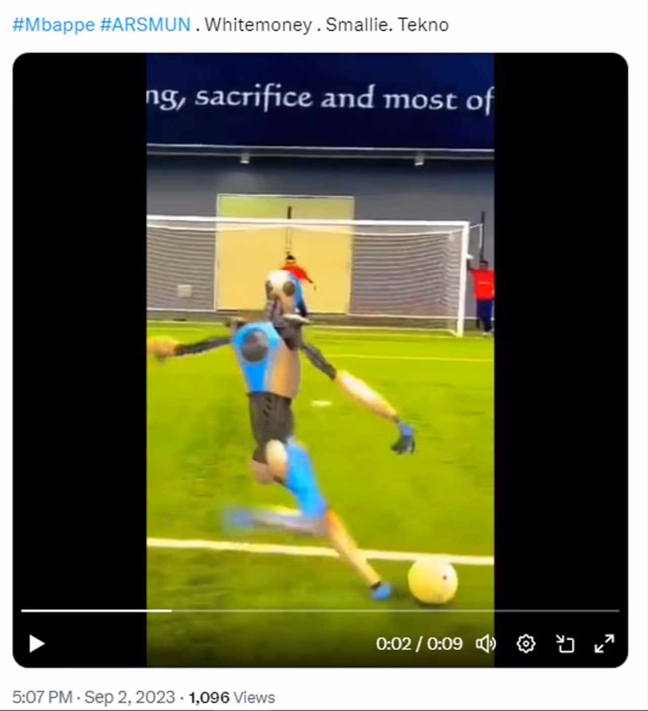 എട്ട് സെക്കന്ഡ് ദൈര്ഘ്യമുള്ള വീഡിയോയാണ് സാമൂഹ്യമാധ്യമമായ ഫേസ്ബുക്കിലും എക്സിലും (ട്വിറ്റര്) നിരവധി പേര് ഷെയര് ചെയ്യുന്നത്. എംബാപ്പെ റോബോട്ടിനൊപ്പം പരിശീലനം നടത്തുന്നു എന്ന ടൈറ്റിലോടെയാണ് ഗാതി എന്നൊരു യൂസര് വീഡിയോ ട്വീറ്റ് ചെയ്തിരിക്കുന്നത്. എംബാപ്പെയുടെ പാസില് റോബോട്ട് ഗോള് നേടുന്നതും ഇരുവരും ആഘോഷിക്കുന്നതും വീഡിയോയിലുണ്ട്. സെപ്റ്റംബര് ആദ്യ വാരം മുതല് ഈ വീഡിയോ നിരവധി ഫുട്ബോള് പ്രേമികളാണ് സാമൂഹ്യമാധ്യമങ്ങളില് പങ്കുവെച്ചിരിക്കുന്നത്.