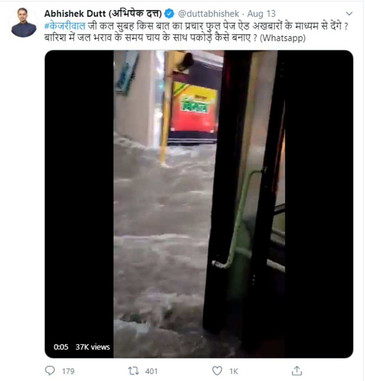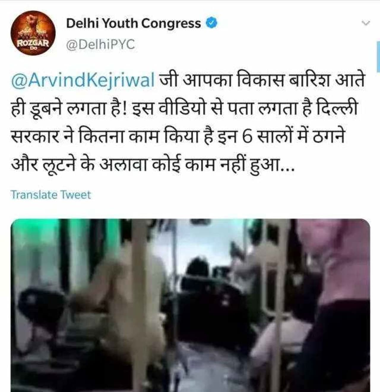 ദില്ലി കോണ്ഗ്രസ് വൈസ് പ്രസിഡന്റായ അഭിഷേക് ദത്താണ് വീഡിയോ ട്വീറ്റ് ചെയ്തത്. ദില്ലിയിലെ കെജ്രിവാള് സര്ക്കാരിനെതിരെ വിമര്ശനം ഉന്നയിക്കുന്നുണ്ട് ദത്ത്. ഓഗസ്റ്റ് 13നാണ് ഈ ട്വീറ്റ് പ്രത്യക്ഷപ്പെട്ടത്. ഓടിക്കൊണ്ടിരിക്കുന്ന ലോ ഫ്ലോര് ബസില് ജലം ഇരച്ചുകയറുന്നത് വീഡിയോയില് വ്യക്തം. ദില്ലി യൂത്ത് കോണ്ഗ്രസിന്റെ ഔദ്യോഗിക ട്വിറ്റര് അക്കൗണ്ടില് നിന്നും സമാന വീഡിയോ ഷെയര് ചെയ്യപ്പെട്ടു.