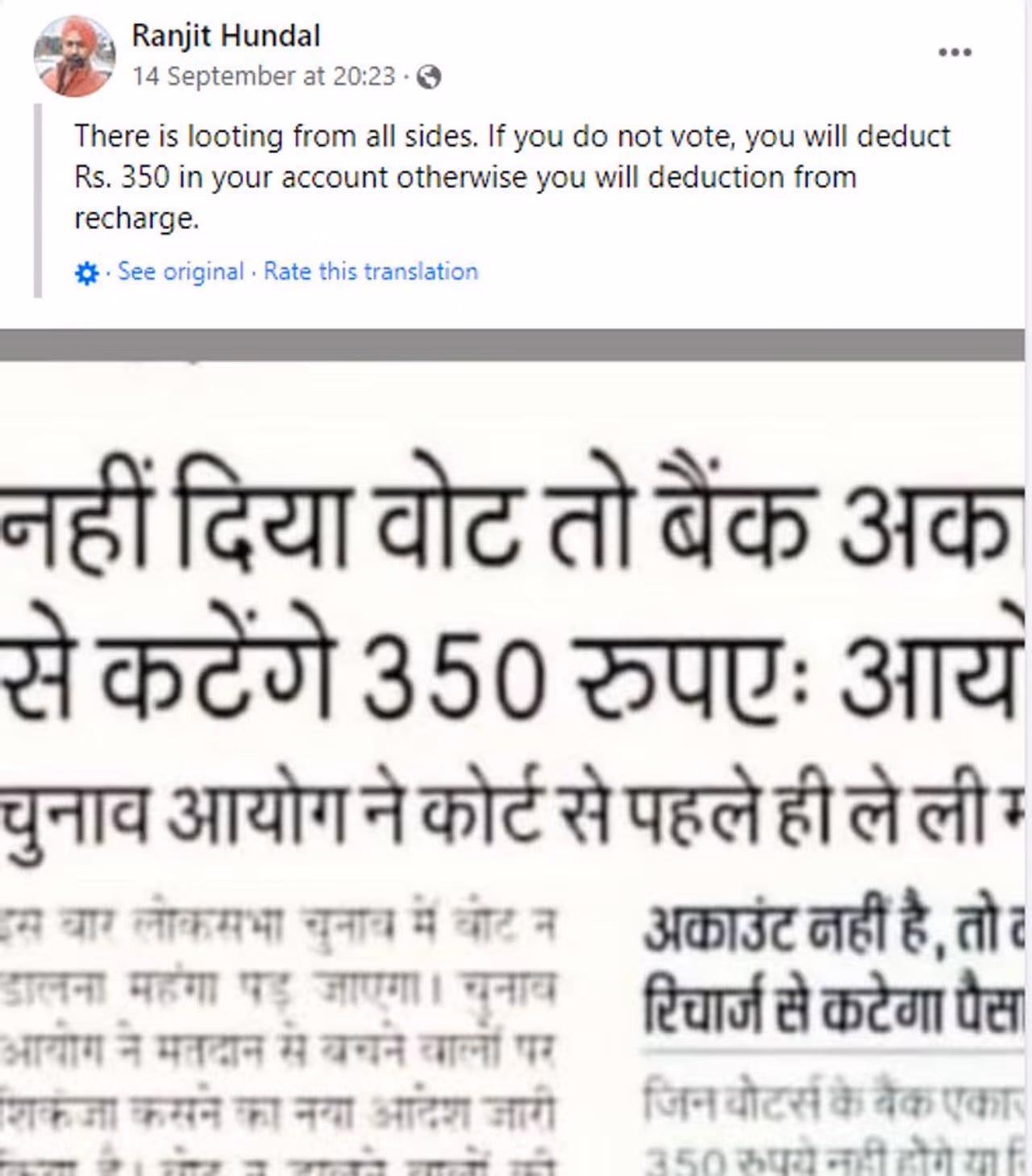 തെരഞ്ഞെടുപ്പ് കാലം ഇന്ത്യയില് വ്യാജ വാര്ത്തകളുടെ കുത്തൊഴുക്ക് കാലമാണ്. 2019ലെ ലോക്സഭാ തെരഞ്ഞെടുപ്പ് വേളയില് നൂറുകണക്കിന് വ്യാജ പ്രചാരണങ്ങളും വാര്ത്തകളുമാണ് പടര്ന്നത്. ഇത്തവണ ഇലക്ഷന് പ്രഖ്യാപിക്കും മുമ്പുതന്നെ വ്യാജ പ്രചാരണം ആരംഭിച്ചിരിക്കുകയാണ്. ലോക്സഭാ തെരഞ്ഞെടുപ്പില് വോട്ട് ചെയ്തില്ലെങ്കില് നിങ്ങളുടെ ബാങ്ക് അക്കൗണ്ടില് നിന്ന് 350 രൂപ പിന്വലിക്കപ്പെടും എന്നാണ് ഈ പ്രചാരണം. 'എല്ലാ ഭാഗത്ത് നിന്ന് കൊള്ളയാണ്. നിങ്ങള് വോട്ട് ചെയ്തില്ലെങ്കില് നിങ്ങളുടെ ബാങ്ക് അക്കൗണ്ടില് നിന്ന് 350 രൂപ പിടിക്കും. അതല്ലെങ്കില് റിച്ചാര്ജില് നിന്ന് ഈ തുക പിഴയായി ഈടാക്കും' എന്നുമാണ് രഞ്ജിത് ഹണ്ടാല് എന്നയാളുടെ ഫേസ്ബുക്ക് പോസ്റ്റ്. എന്താണ് ഇതിന്റെ വസ്തുത എന്ന് നോക്കാം.