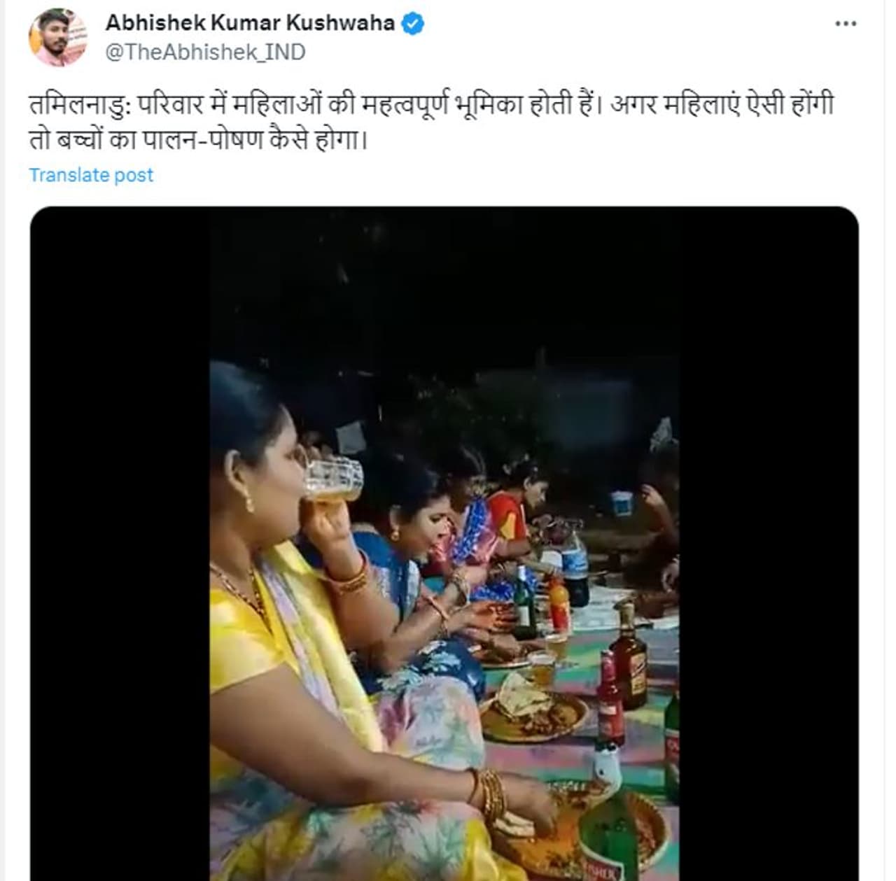'തമിഴ്നാട്: സ്ത്രീകള്ക്ക് കുടുംബത്തില് വലിയ പ്രാധാന്യമുണ്ട്. സ്ത്രീകള് ഇങ്ങനെ മദ്യപിക്കുന്നവരാണ് എങ്കില് കൂട്ടികള് എങ്ങനെയാവും വളരുക?' എന്ന ചോദ്യത്തോടെയാണ് അഭിഷേക് കുമാര് കഷ്വാഹ എന്ന യൂസര് വീഡിയോ ട്വീറ്റ് ചെയ്തിരിക്കുന്നത്. 2023 നവംബര് 21ന് ട്വീറ്റ് ചെയ്ത വീഡിയോയ്ക്ക് 42 സെക്കന്ഡാണ് ദൈര്ഘ്യം. ഈ വീഡിയോ തമിഴ്നാട്ടില് നിന്നുള്ളതല്ല, തെലങ്കാനയില് നിന്നുള്ളതാണ് എന്ന് പലരും ട്വീറ്റിന് താഴെ മറുപടി രേഖപ്പെടുത്തിയിരിക്കുന്ന സാഹചര്യത്തില് വീഡിയോയുടെ വസ്തുത പരിശോധിക്കാം.