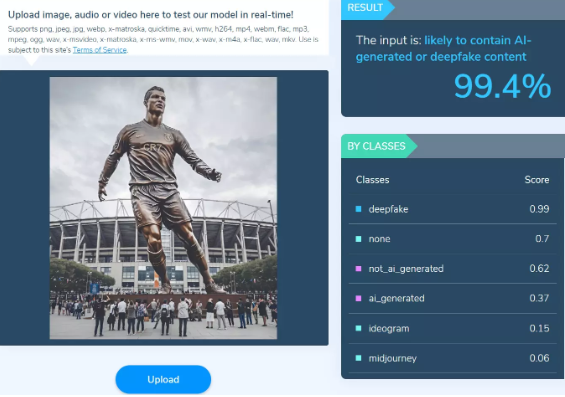 മാത്രമല്ല, ക്രിസ്റ്റ്യാനോ റൊണാള്ഡോയുടെ ഇന്സ്റ്റഗ്രാം അടക്കമുള്ള സോഷ്യല് മീഡിയ ഹാന്ഡിലുകള് പരിശോധിച്ചപ്പോഴും വിവരങ്ങളൊന്നും ലഭിച്ചില്ല. ഇതോടെ ഈ ഫോട്ടോ എഐ നിര്മ്മിതമാണോ എന്ന് തിരഞ്ഞു. എഐ ഡിറ്റക്ഷന് ടൂളായ ഹൈവ് മോഡറേഷനില് നടത്തിയ പരിശോധനയില് ഈ ചിത്രം ആര്ട്ടിഫിഷ്യല് ഇന്റലിജന്സ് നിര്മ്മിതമാവാന് 99 ശതമാനം സാധ്യത തെളിഞ്ഞു. മറ്റ് എഐ ഫോട്ടോ ഡിറ്റക്ഷന് ടൂളുകളും ഈ ഫോട്ടോ യഥാര്ഥമല്ല എന്നുതന്നെ വ്യക്തമാക്കി. ഫോട്ടോയുടെ വസ്തുത ഇതില് നിന്ന് മനസിലാക്കാം.