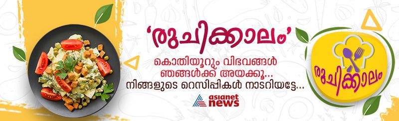 'രുചിക്കാലം' വ്യത്യസ്തമായ പാചകക്കുറിപ്പുകളുടെ ഈ ആഘോഷത്തിൽ പങ്കാളിയാവാൻ താൽപ്പര്യമുണ്ടോ? ഉണ്ടെങ്കിൽ നിങ്ങൾ തയ്യാറാക്കിയ വ്യത്യസ്തമായ പാചകക്കുറിപ്പുകൾ നല്ലൊരു ഫോട്ടോയും വിശദമായ വിലാസവും അടക്കം ruchikalamrecipes@gmail.com എന്ന വിലാസത്തിൽ അയക്കുക. യൂട്യൂബ് വീഡിയോ ഉണ്ടെങ്കിൽ അതിന്റെ ലിങ്ക് കൂടി അയക്കാം. സബ്ജക്റ്റ് ലൈനിൽ Recipes എന്ന് എഴുതണം. മികച്ച പാചകക്കുറിപ്പുകൾ രുചിക്കാലം പ്രസിദ്ധീകരിക്കും.